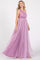 A maxi dress featuring a one shoulder neckline, a side zipper and an A-line skirt with a tulle overlay.