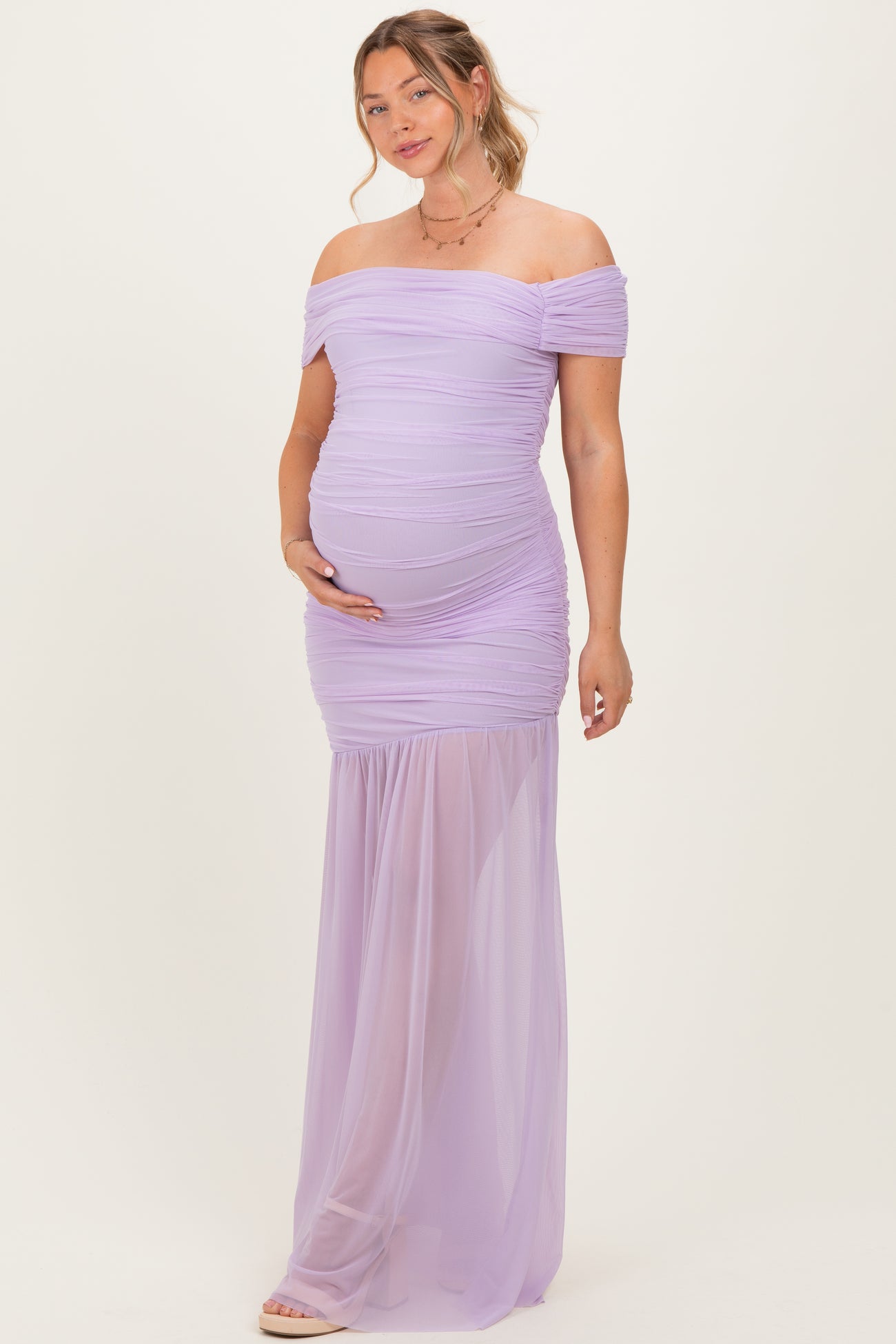 Lavender Ruched Mesh Off Shoulder Maternity Maxi Dress