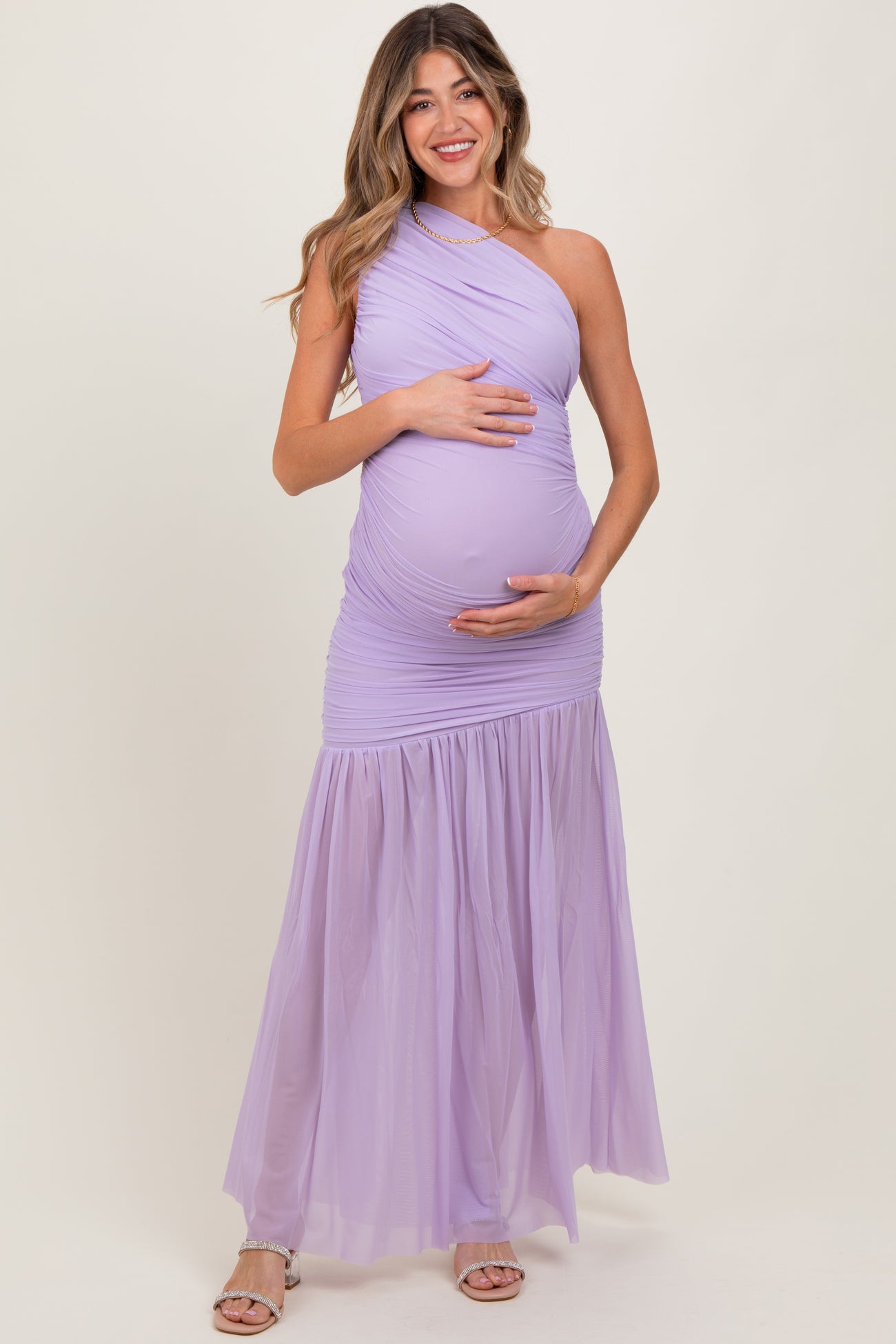 Lavender Ruched Mesh One Shoulder Maternity Maxi Dress