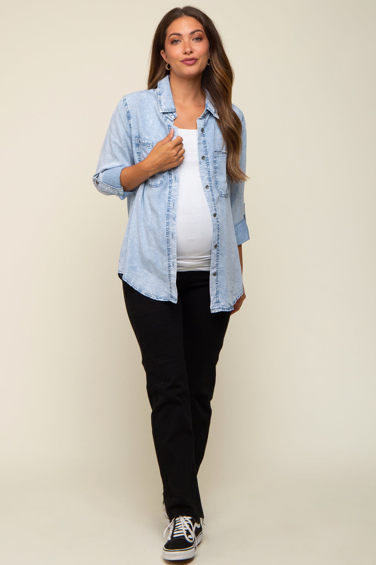 Meet your new go-to maternity shirt! This Chambray Maternity Rolled Cuff Shirt combines style and comfort for every stage of pregnancy. Crafted from soft, breathable fabric, it features a classic button-down front, chest pocket, and adjustable rolled cuff sleeves for versatile wear. The relaxed fit flatters your bump while giving you plenty of room to grow, making it perfect for layering or wearing on its own. Dress it up with trousers for the office or keep it casual with leggings or jeans. Stay chic and comfortable wherever you go with this must-have maternity essential!