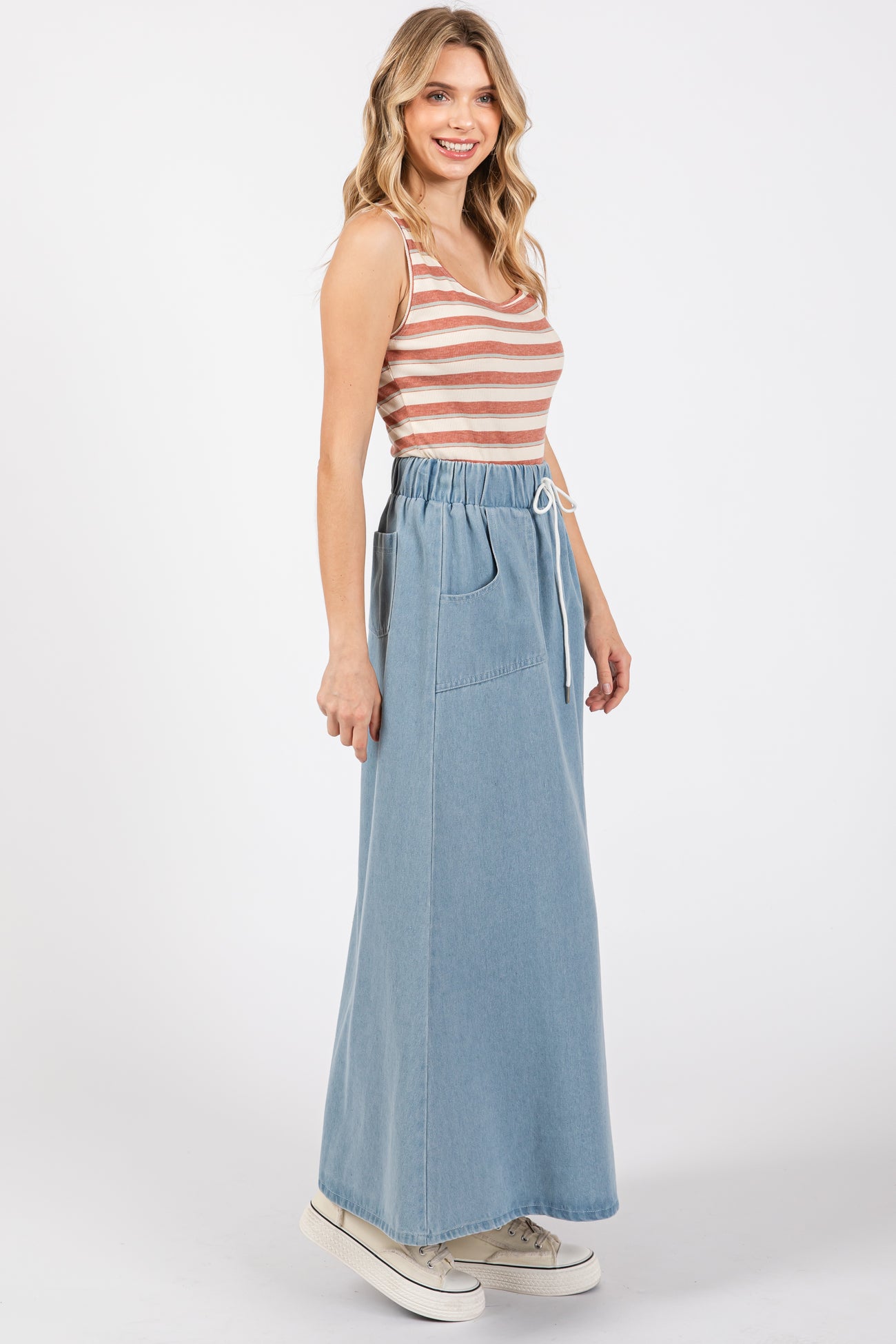 A denim maxi skirt with an elastic waistband, a front tie, front pockets, and back pockets.