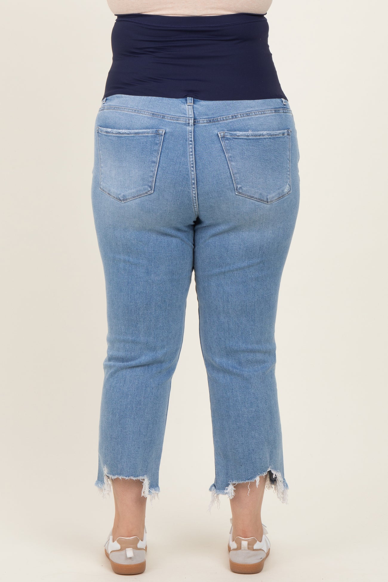 Stay stylish and comfortable throughout your pregnancy with our Light Blue Distressed Hem Cropped Straight Leg Maternity Plus Jeans. Crafted from soft, stretchy denim, these jeans feature a flattering straight leg cut and a trendy cropped length with a distressed, frayed hem for an edgy look. The high-rise, elastic waistband gently supports your growing belly, ensuring all-day comfort and a secure fit. Perfect for casual outings or everyday wear, these jeans pair effortlessly with your favorite tops and shoes. Available in plus sizes, these maternity jeans are designed to adapt to your changing shape while keeping you looking chic and confident.