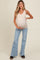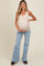 A light wash pair of maternity flare leg jeans with a five pockets and a full panel elastic bellyband. Material has medium stretch.