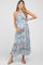 A floral chiffon print maternity midi dress featuring a smocked elastic top, adjustable straps, a ruffle hem and double lined.