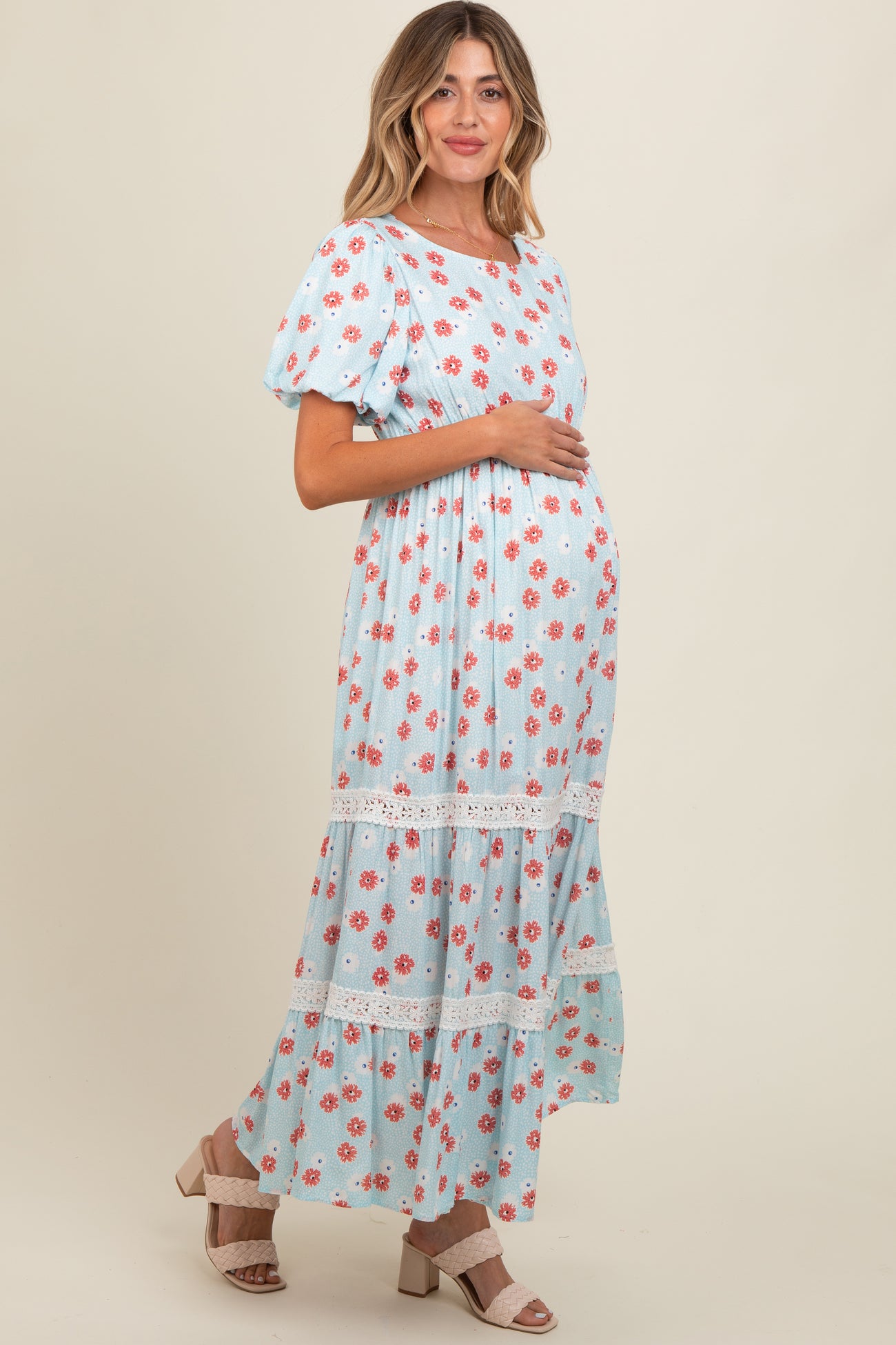 Light Blue Floral Lace Trim Maternity Maxi Dress