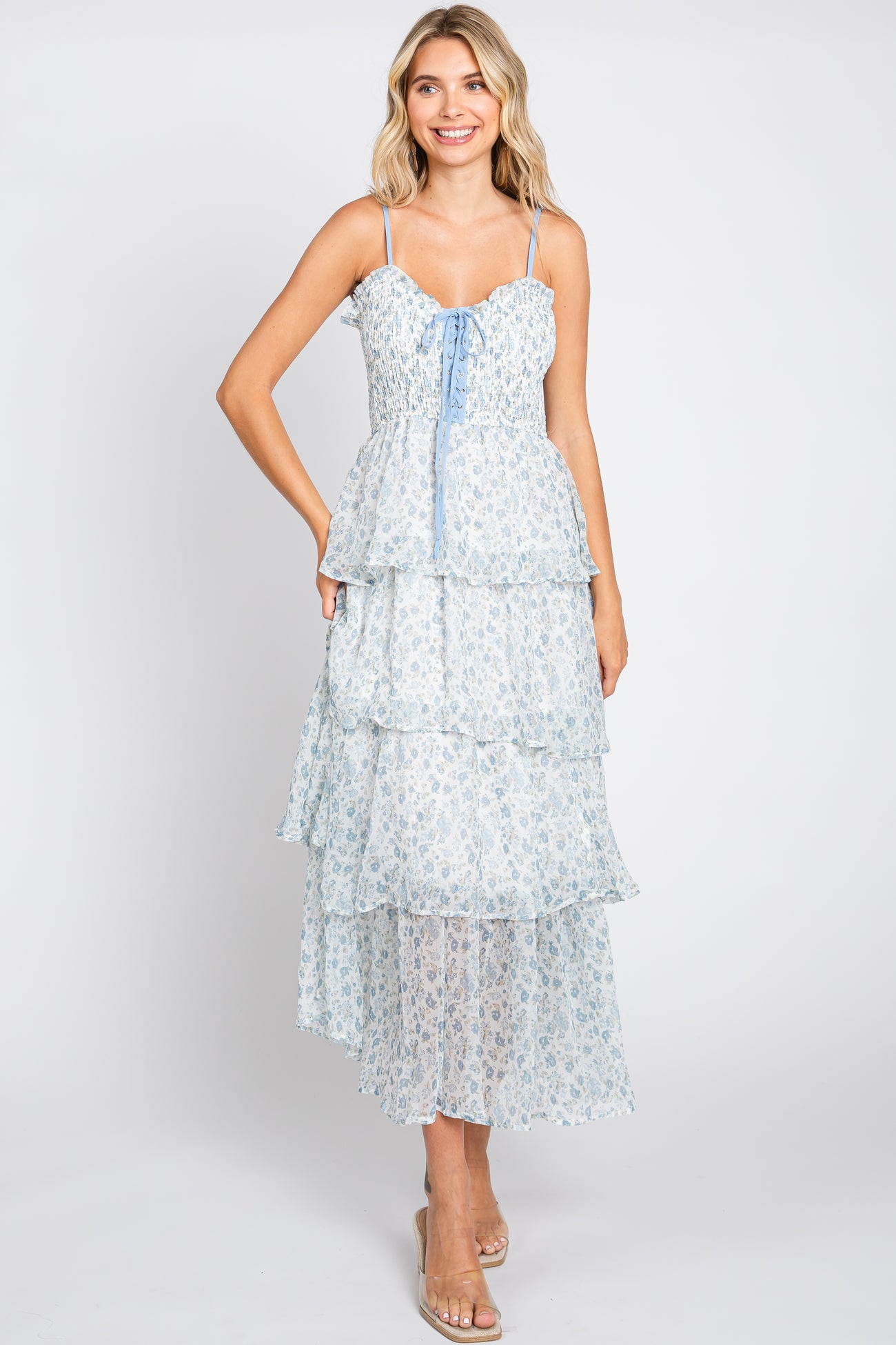 Light Blue Floral Sleeveless Tiered Maxi Dress