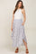 A floral maternity midi skirt with a smocked elastic waist, side pockets, and a rounded hem.
