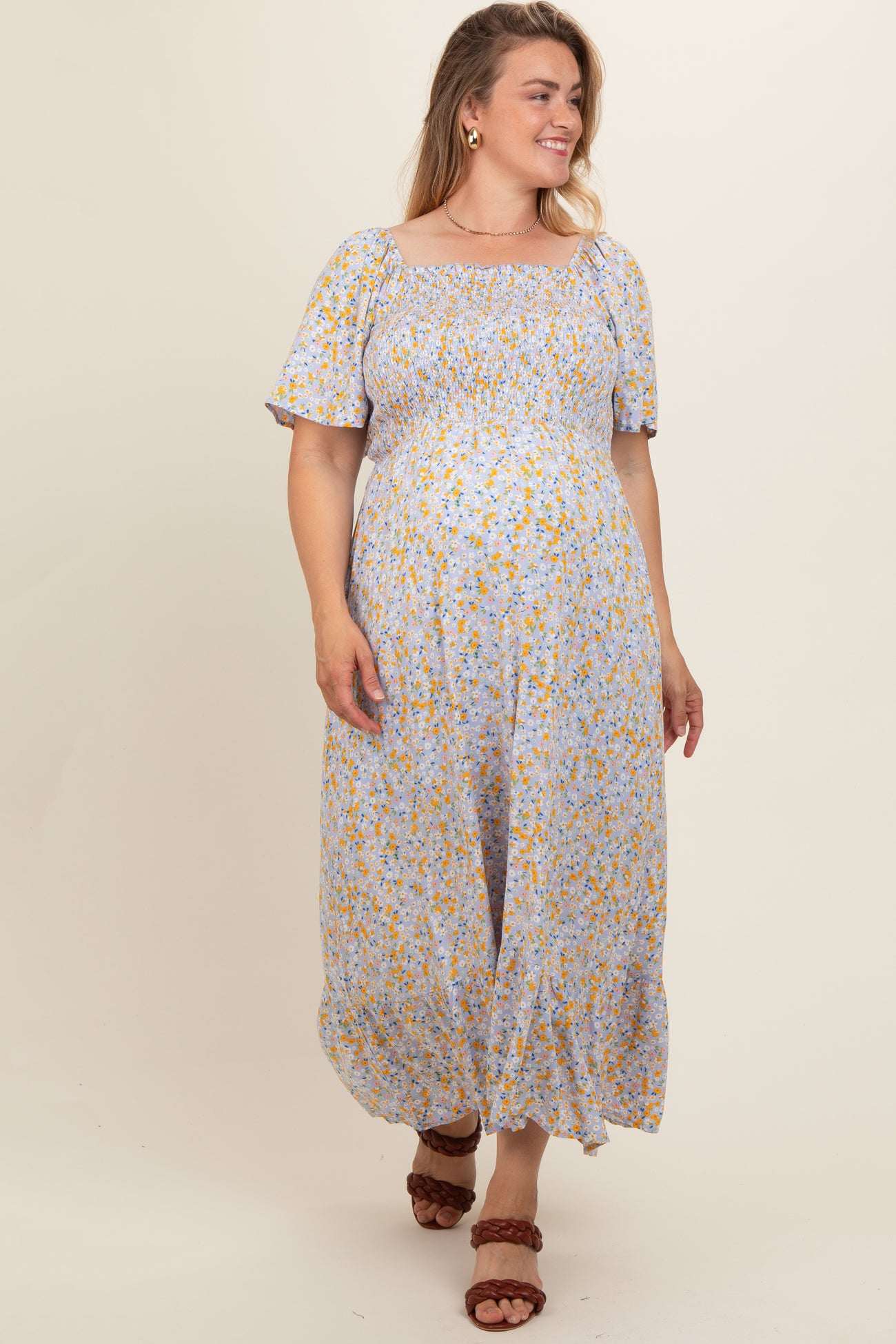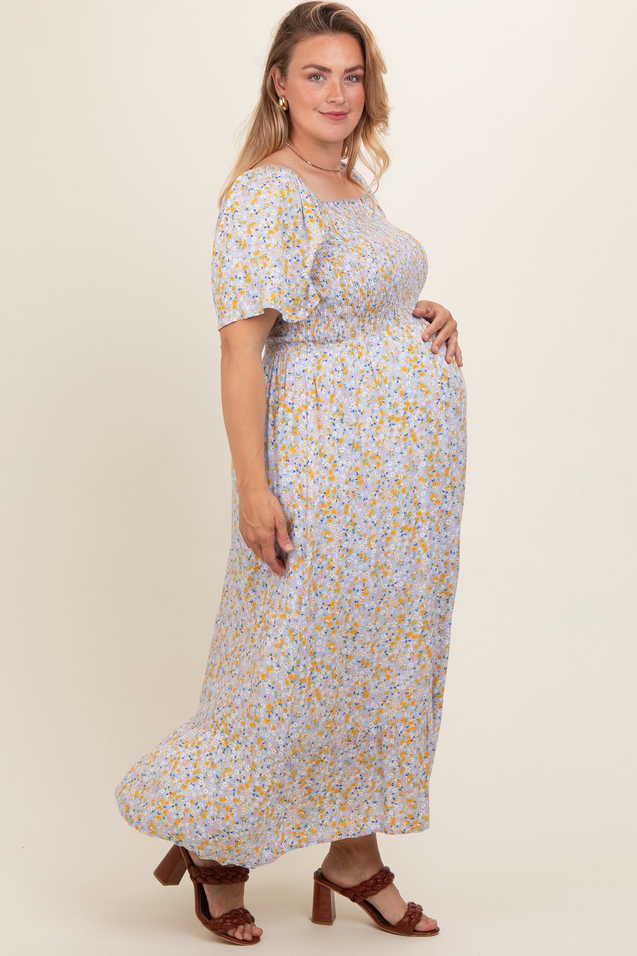 Light Blue Floral Smocked Plus Maternity Maxi Dress
