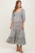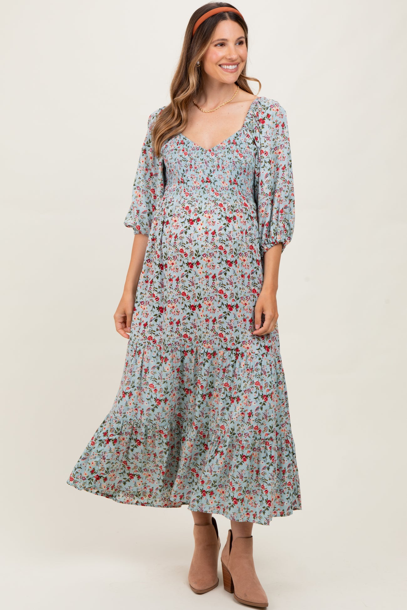 Light Blue Floral Smocked Sweetheart Neckline Maternity Midi Dress