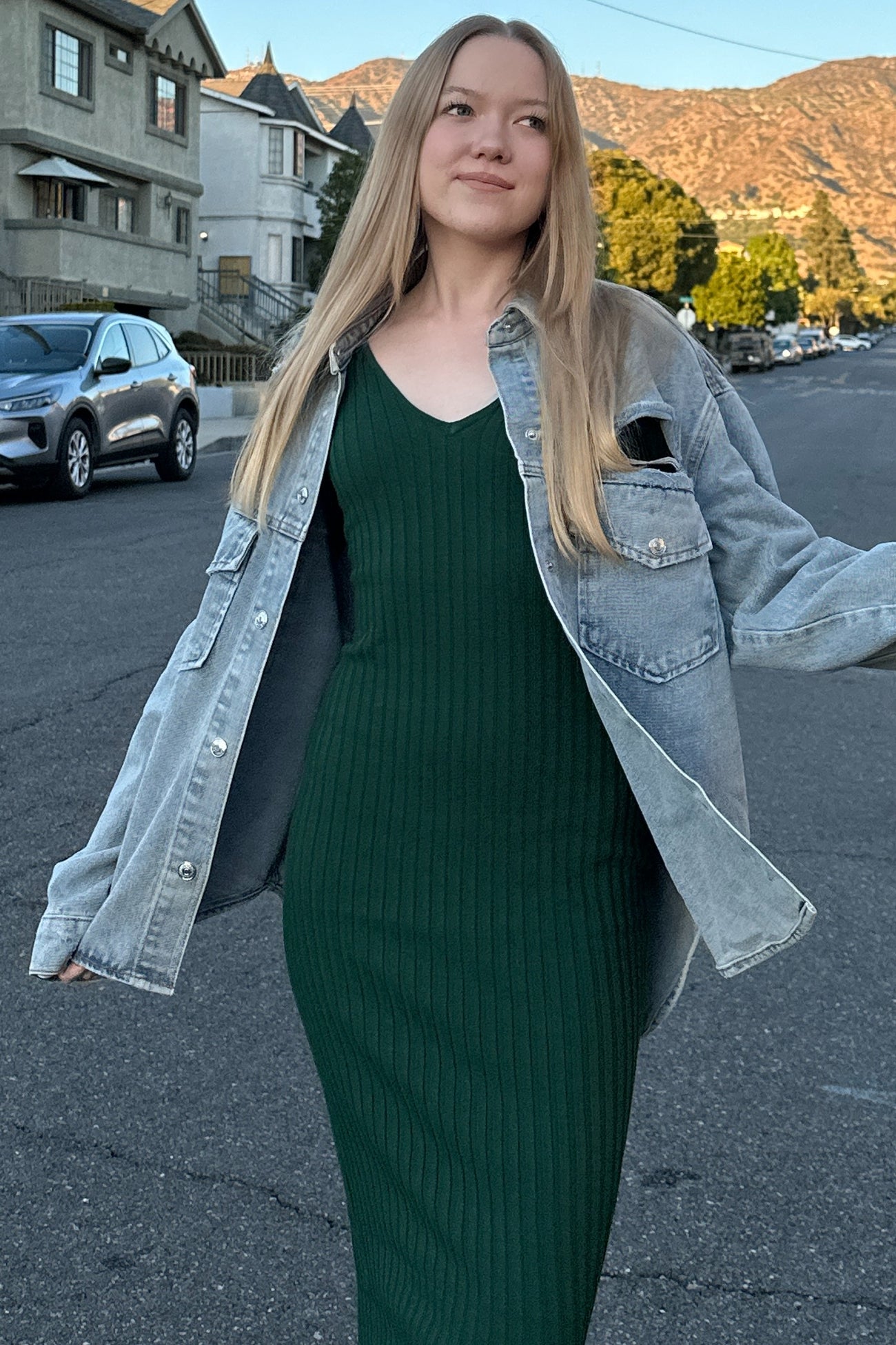 A denim shacket with a collar, front snap buttons, two front pockets, long cuffed sleeves, and a hi-lo curved hem. Distresses accents featured throughout.