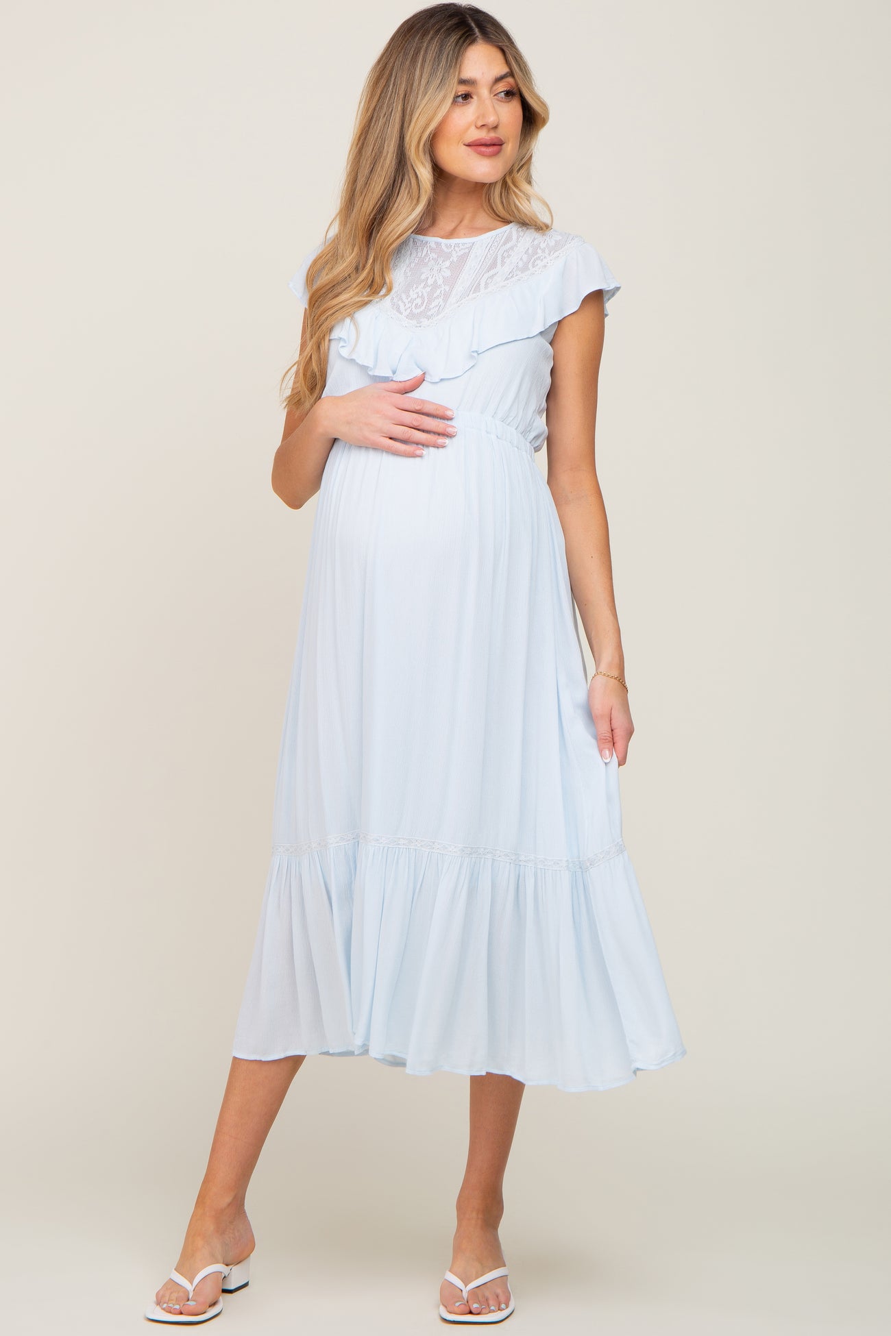 Light Blue Lace Inset Ruffle Maternity Midi Dress