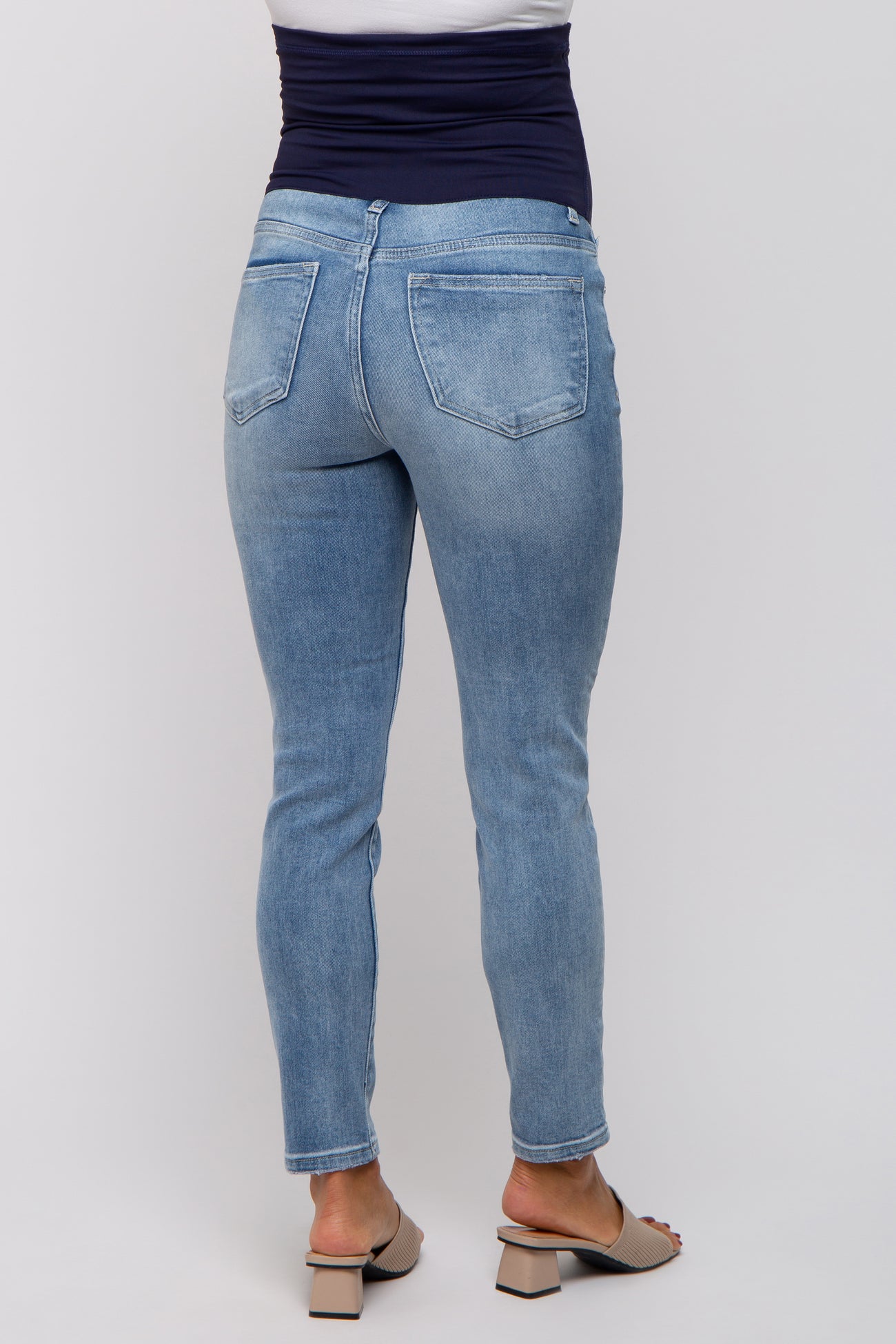 A pair of light washed maternity skinny jeans with 5 pockets and an elastic belly band. Features slight distressing along the pockets.