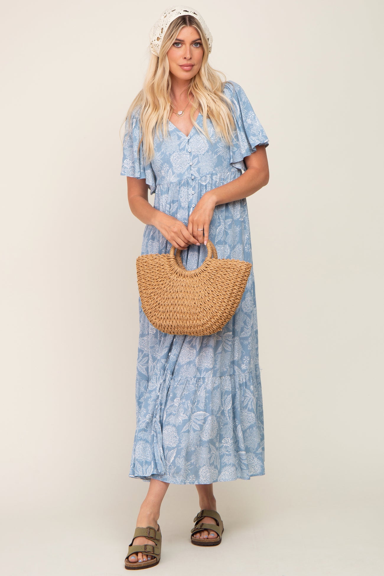 Light Blue Paisley Button Down Tiered Maxi Dress