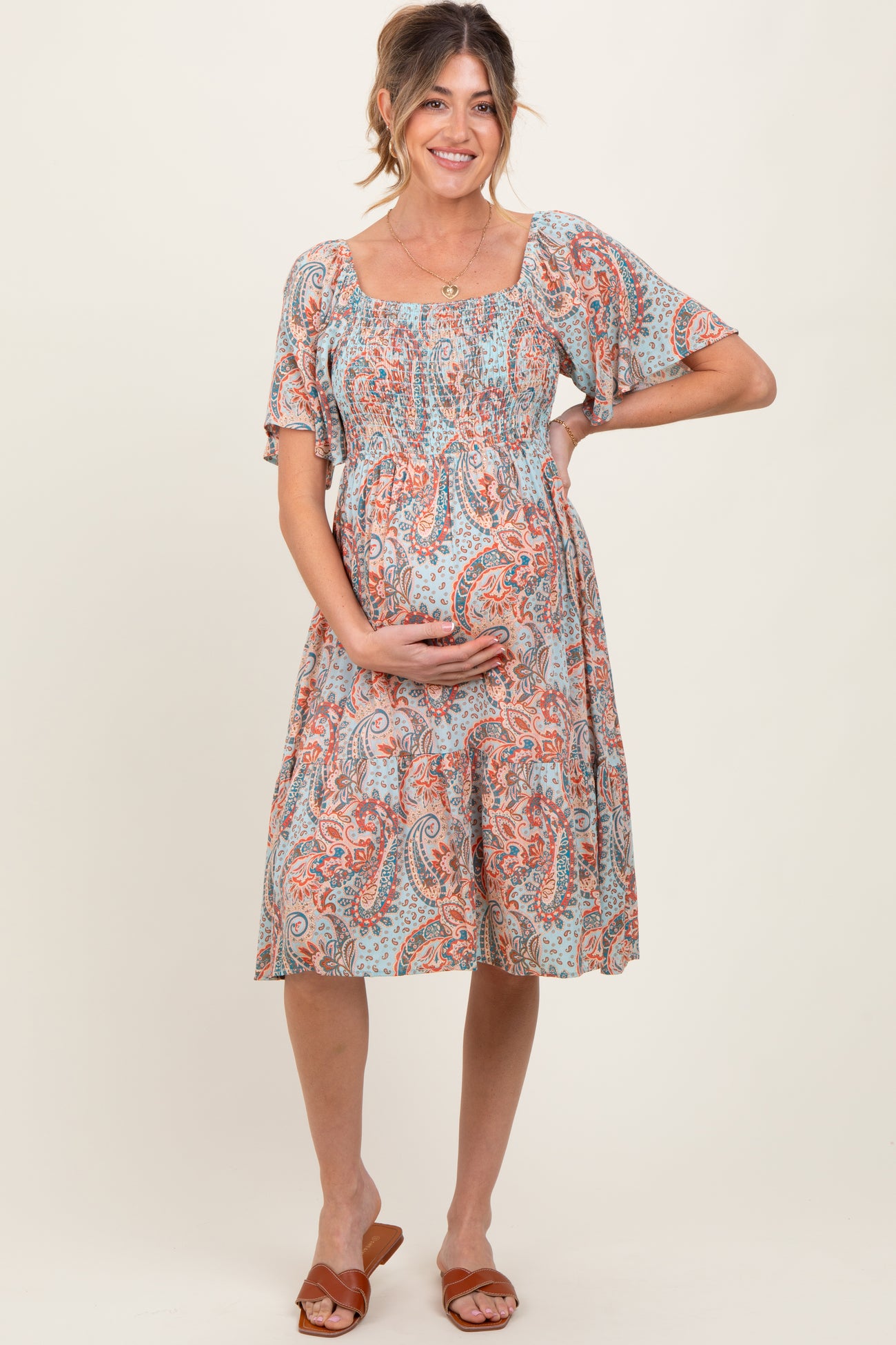 Light Blue Paisley Floral Smocked Maternity Midi Dress
