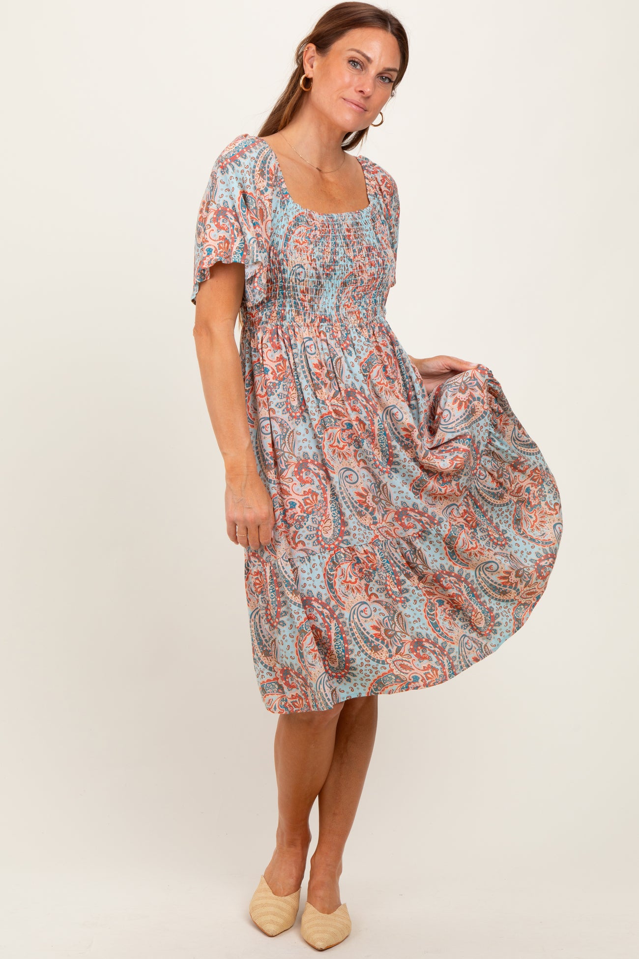 Light Blue Paisley Floral Smocked Midi Dress