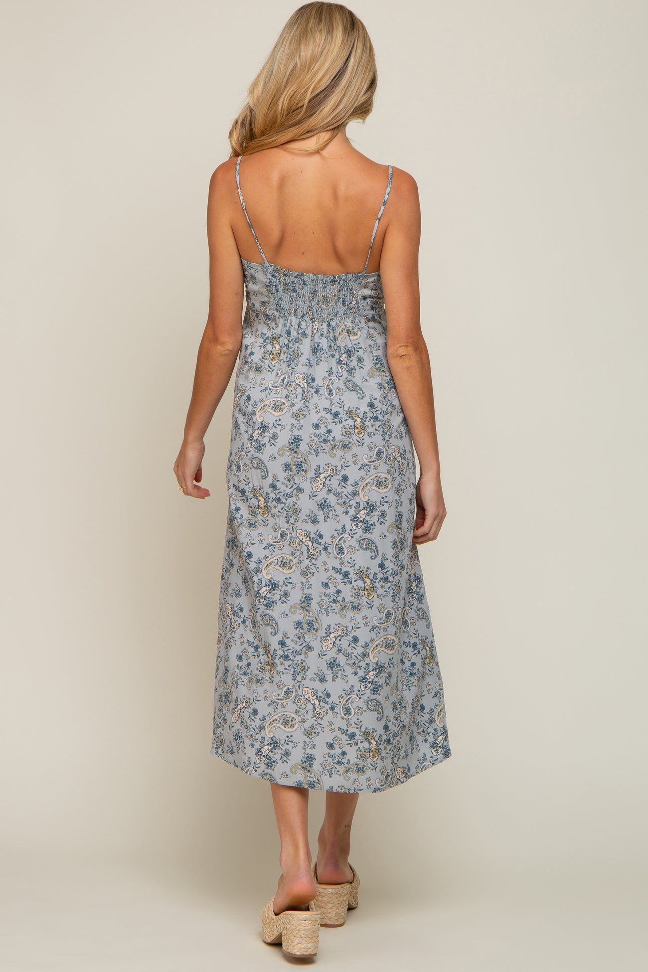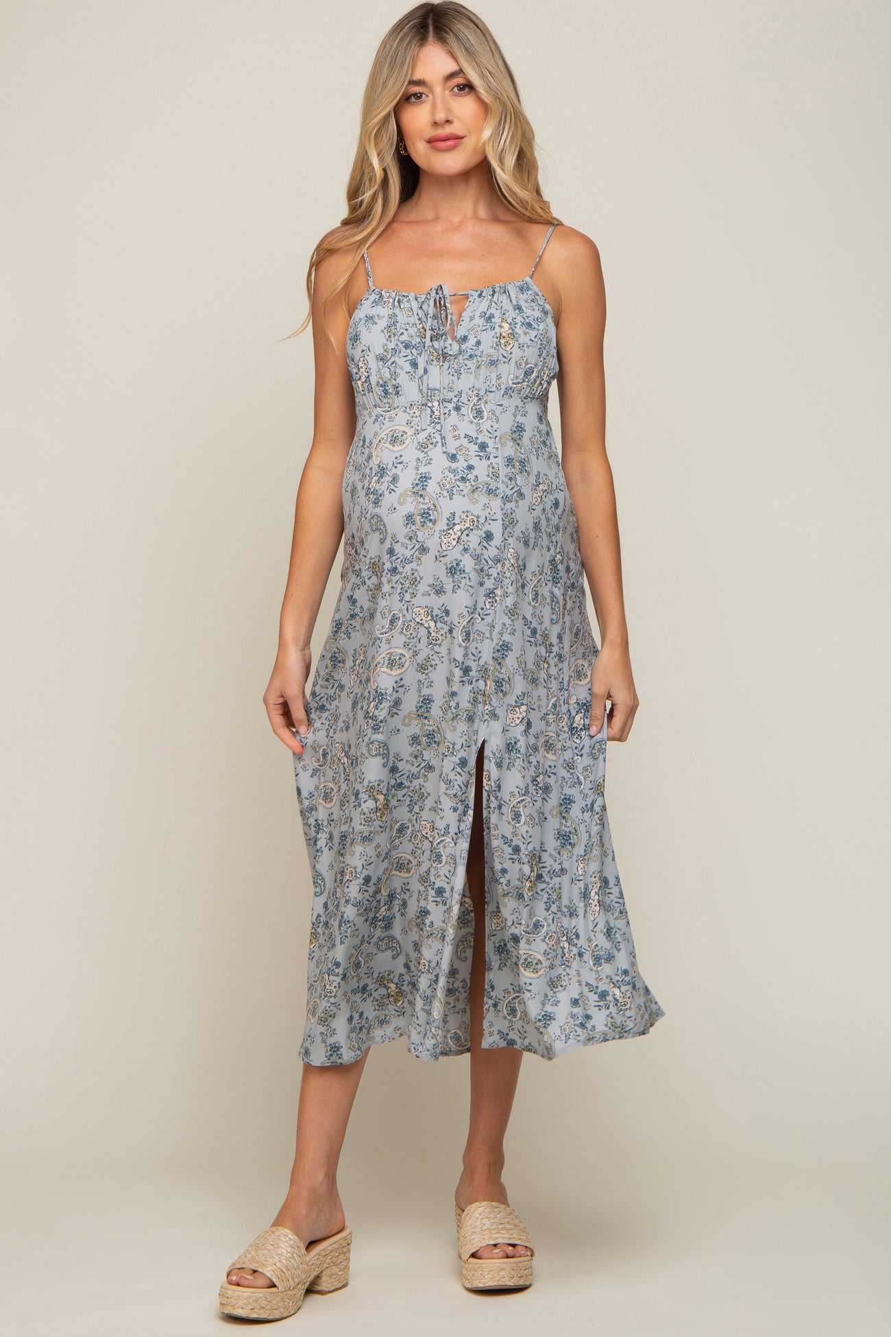 Light Blue Paisley Front Tie Maternity Midi Dress
