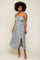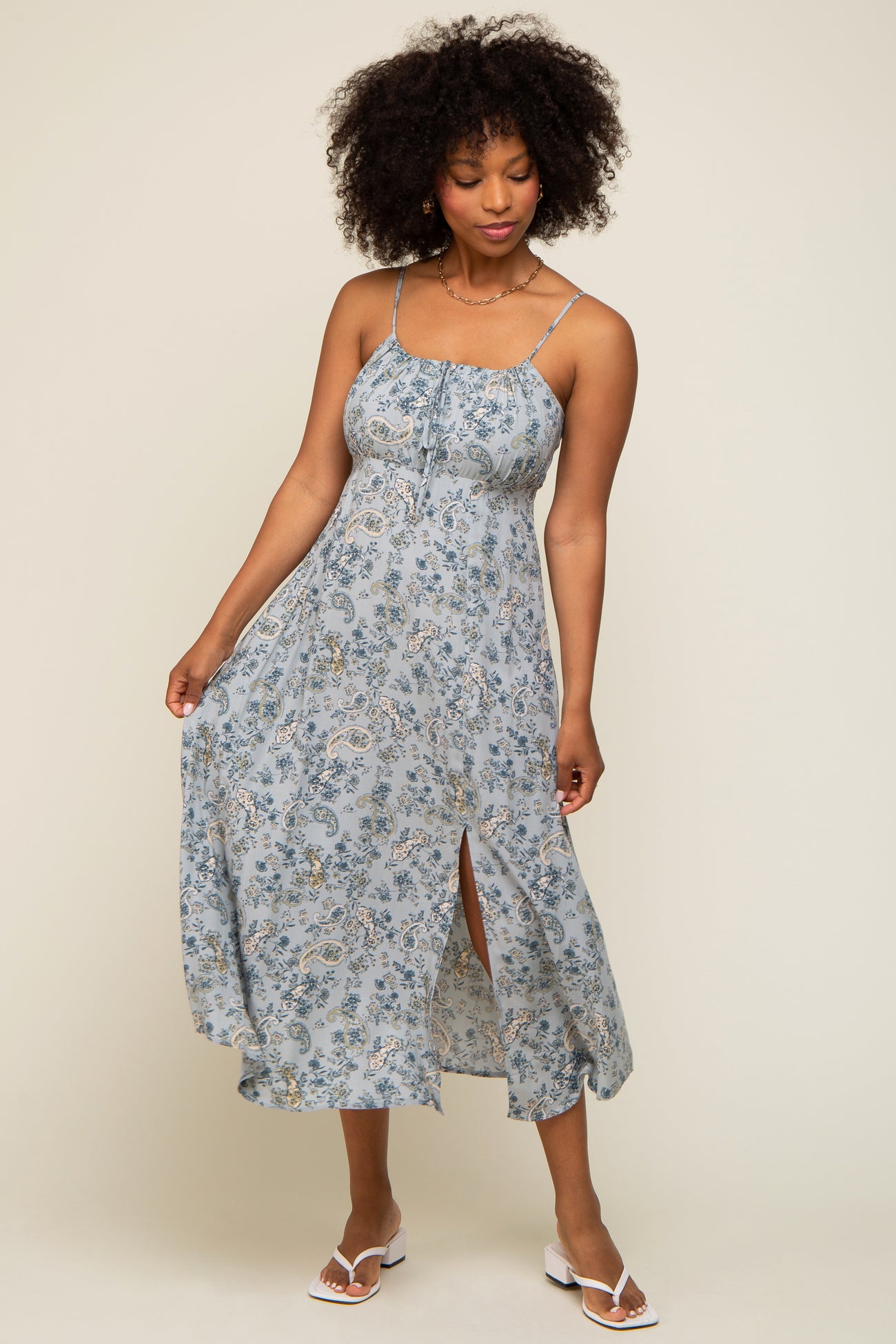 A paisley midi dress with a front tie that adjusts the straps, shirring at the bust, and a side slit.