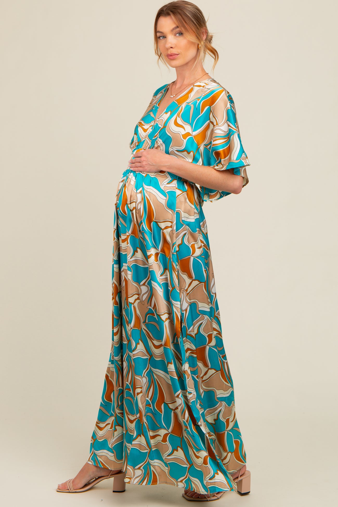 Light Blue Printed Deep V-Neck Maternity Maxi Dress