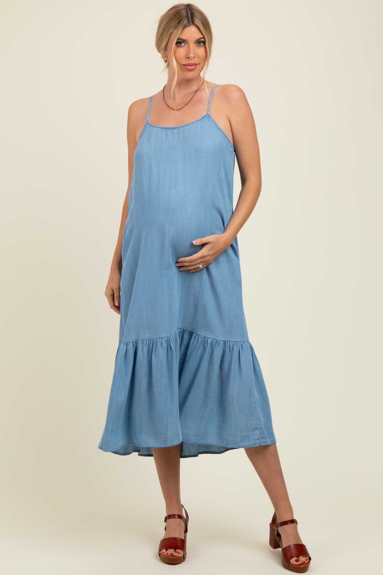 Light Blue Ruffle Hem Cami Maternity Midi Dress