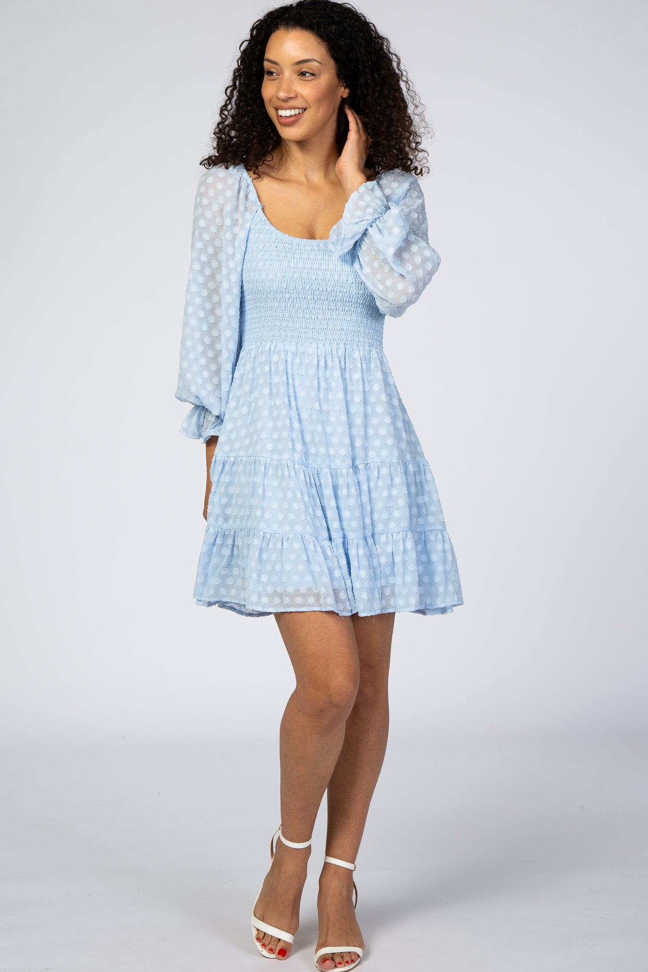 Light Blue Smocked Polka Dot Long Sleeve Maternity Dress
