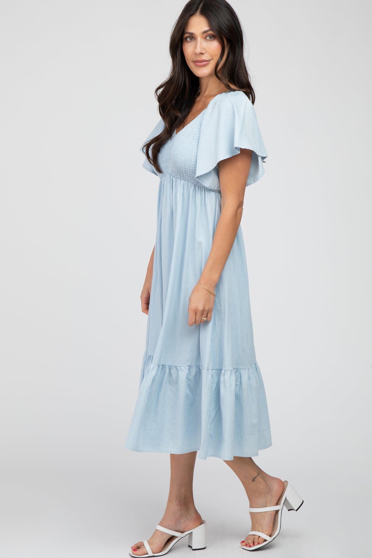 A solid hued midi dress featuring a smocked top, short sleeves, a ruffle hem and a v-neckline.
