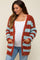 A striped maternity cardigan in a fuzzy knit with a v-neckline, button closure and two front pockets.