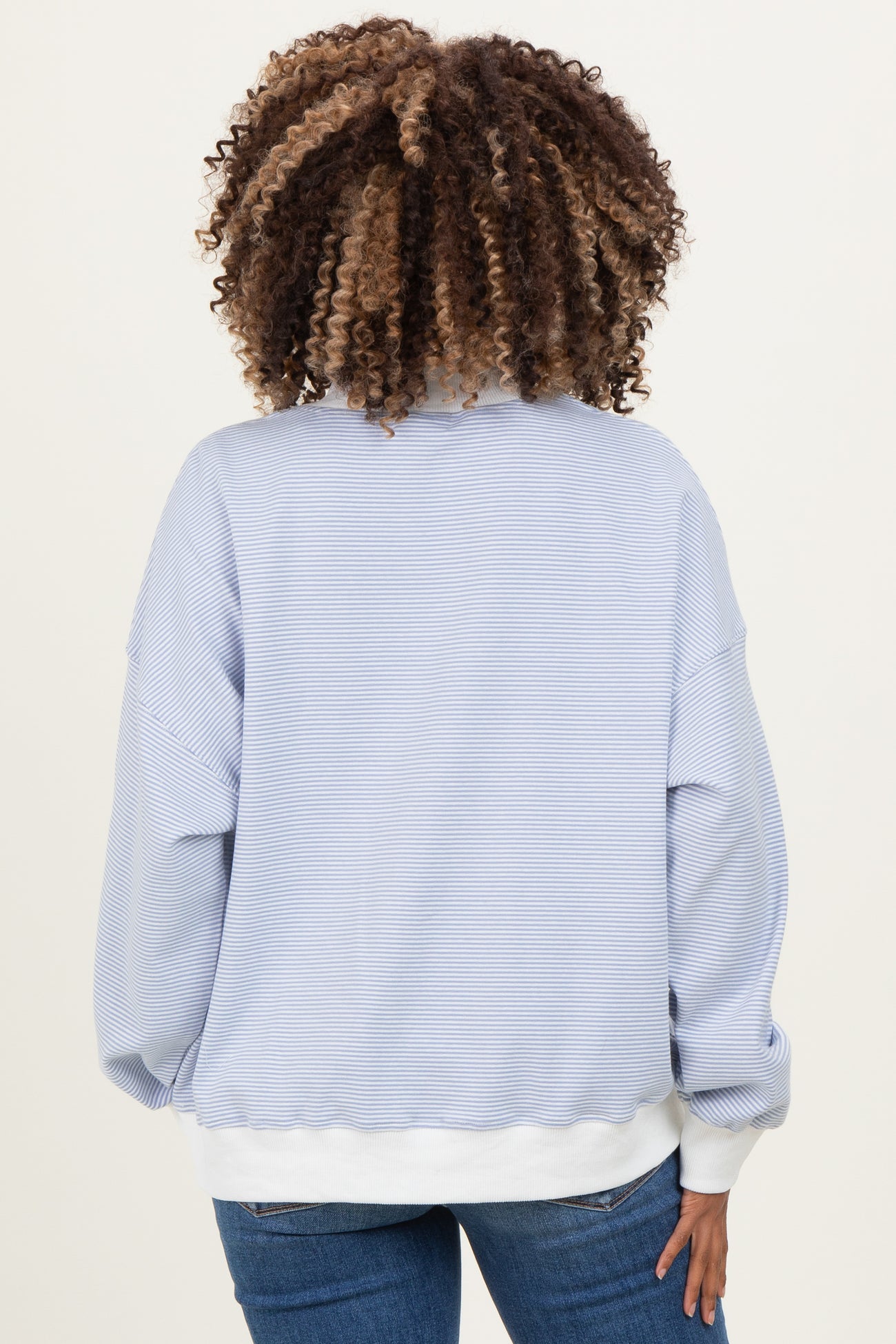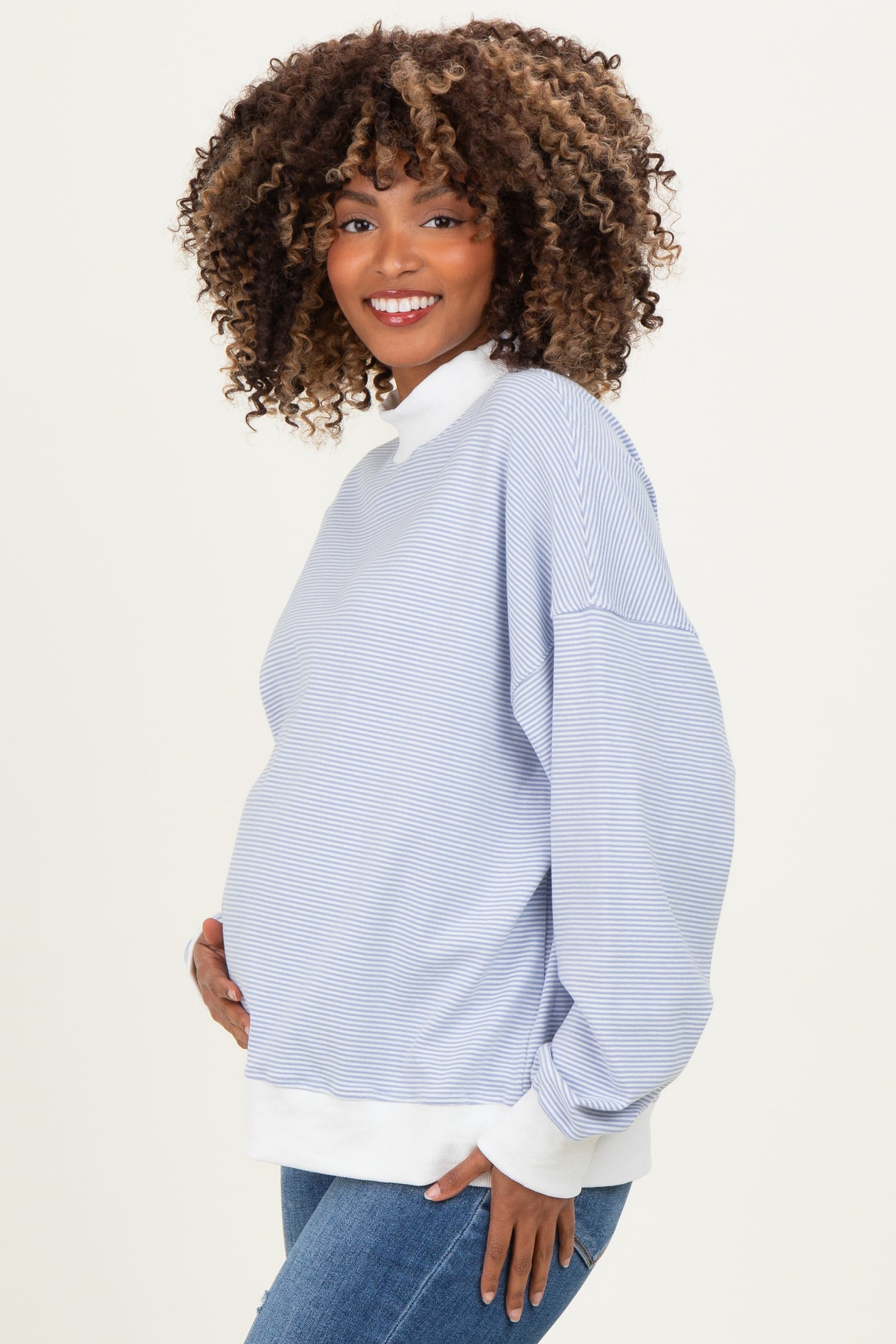Stay cozy and stylish throughout your pregnancy with this striped mock neck maternity sweatshirt. Designed with soft, breathable fabric and a relaxed fit, it gently accommodates your growing bump while providing all-day comfort. The mock neck adds a chic touch, perfect for layering or wearing on its own during cooler days. Ribbed cuffs and hem offer a secure yet flexible fit, making it easy to move freely. Whether you're running errands or enjoying a casual day out, this sweatshirt combines practicality and fashion effortlessly to keep you comfortable and confident.