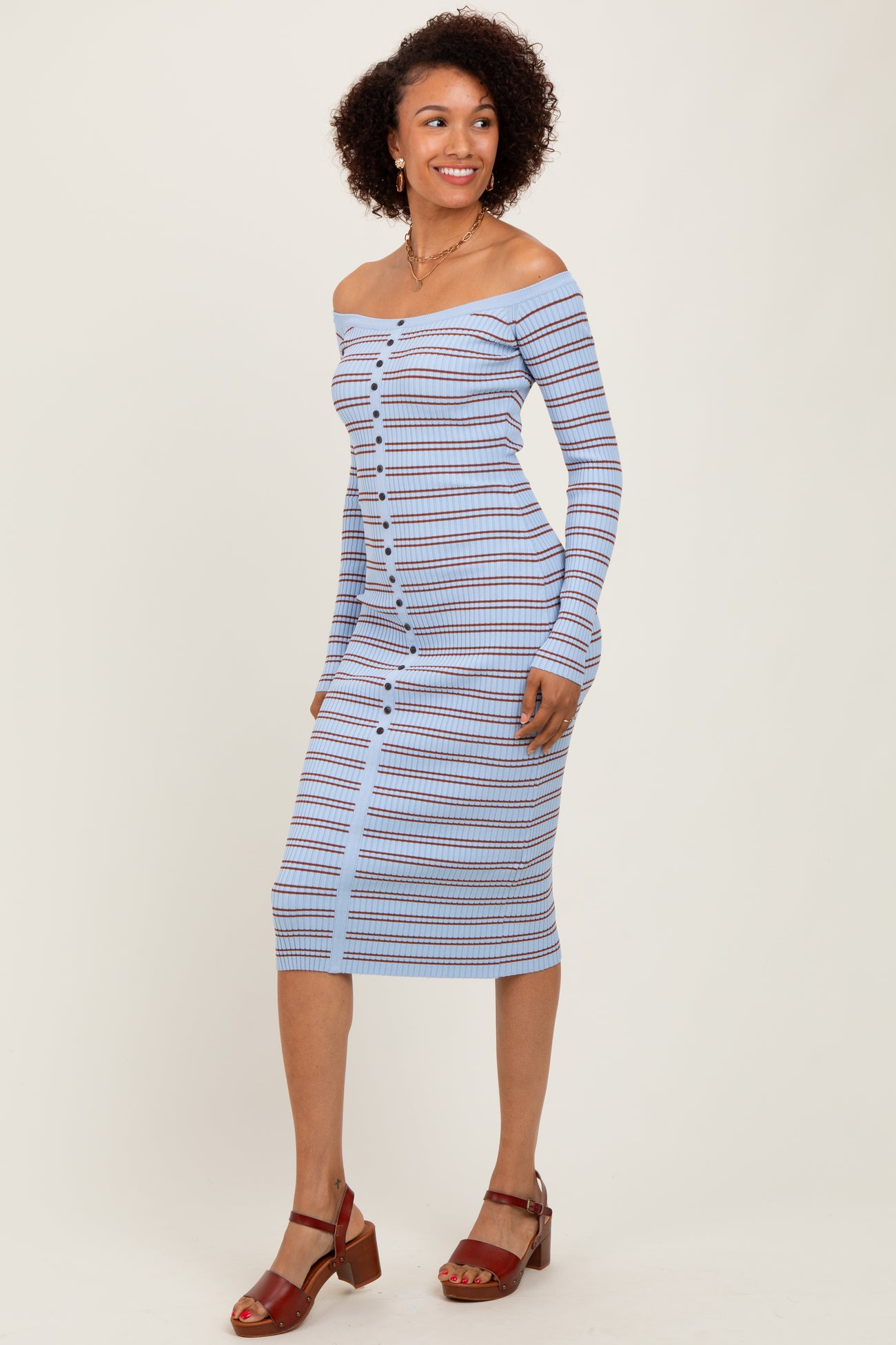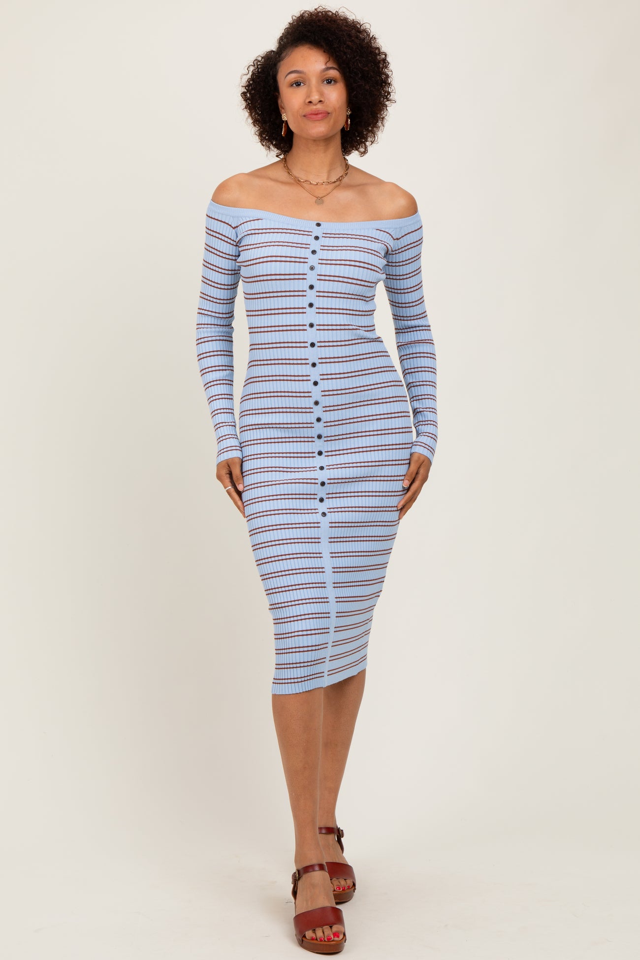 Step out in style with our Light Blue Striped Ribbed Button Accent Off Shoulder Dress. This figure-flattering midi dress features a ribbed texture with horizontal stripes in soft blue and brown hues, perfect for adding a chic touch to your wardrobe. The off-shoulder neckline beautifully highlights your collarbones, while the front button detail adds a trendy accent down the center. Crafted from a comfortable, stretchy fabric, it offers a snug fit that moves with you. Ideal for casual outings or dressier occasions, pair it with sandals or heels for a versatile look that transitions effortlessly from day to night.