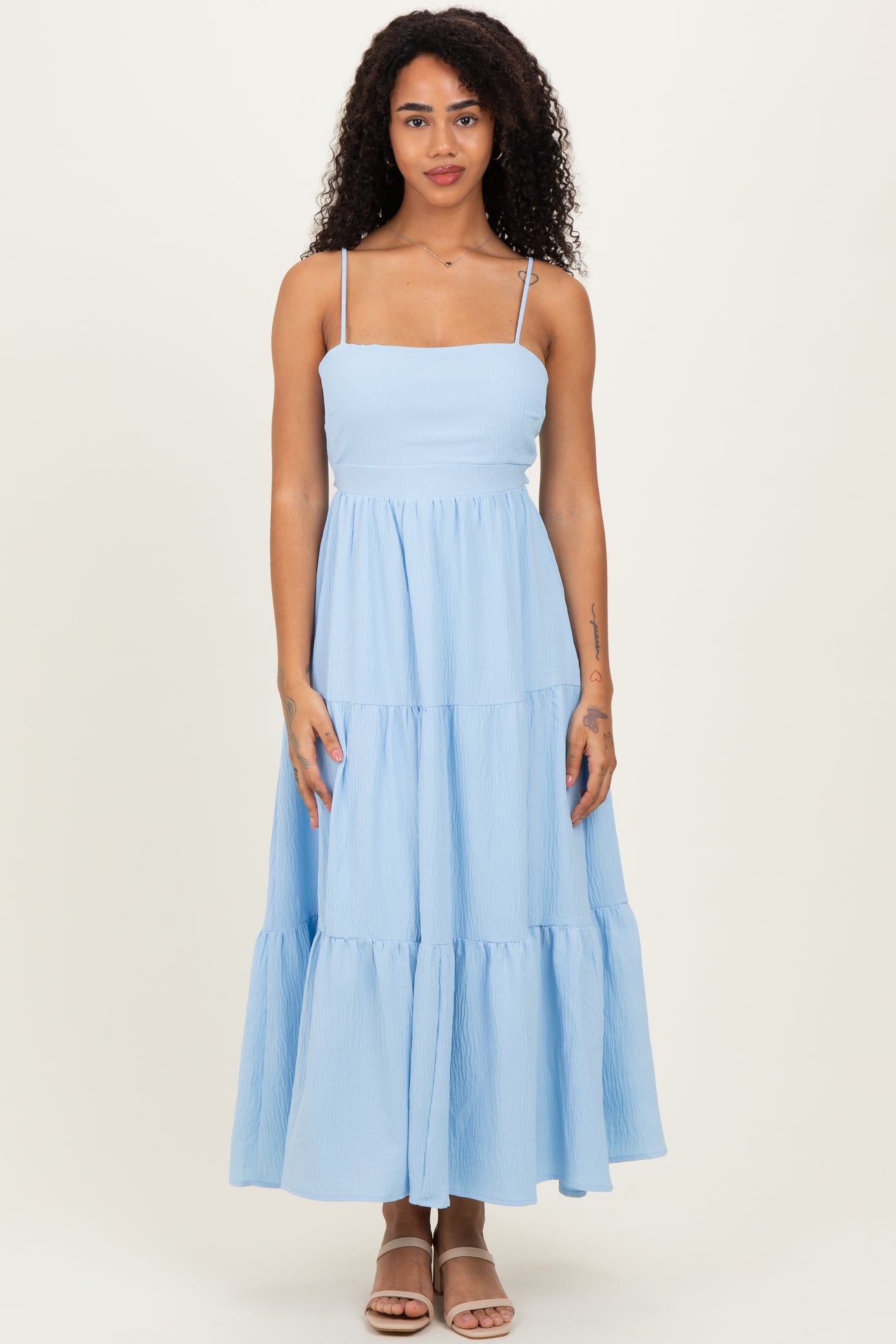 Embrace effortless elegance with this tiered cutout tie back maternity midi dress, designed to grow with you throughout your pregnancy. Featuring delicate spaghetti straps and a flattering square neckline, this dress offers both comfort and style. The tiered skirt creates a flowy silhouette that moves gracefully, while the adjustable tie back detail highlights your shape and provides a customizable fit. Crafted from lightweight, breathable fabric, it’s perfect for warm days or special occasions. Pair with your favorite sandals or heels for a chic, maternity-ready look you'll love.