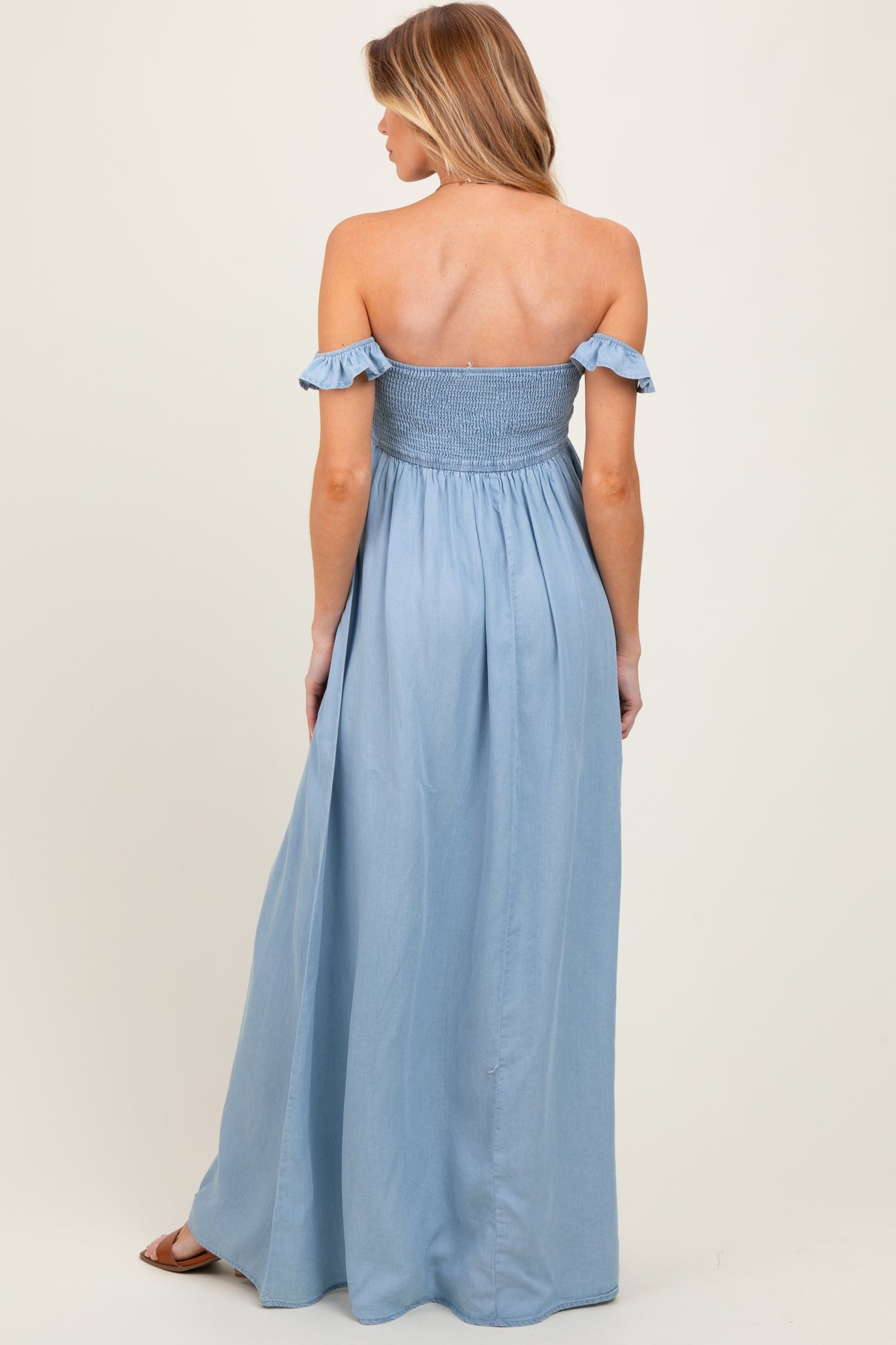 Light Chambray Smocked Denim Off-Shoulder Maternity Maxi Dress
