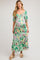 A floral maternity maxi dress featuring smocked top, a squared neckline, short puff sleeves, front button accents, and a gathered bottom tier.