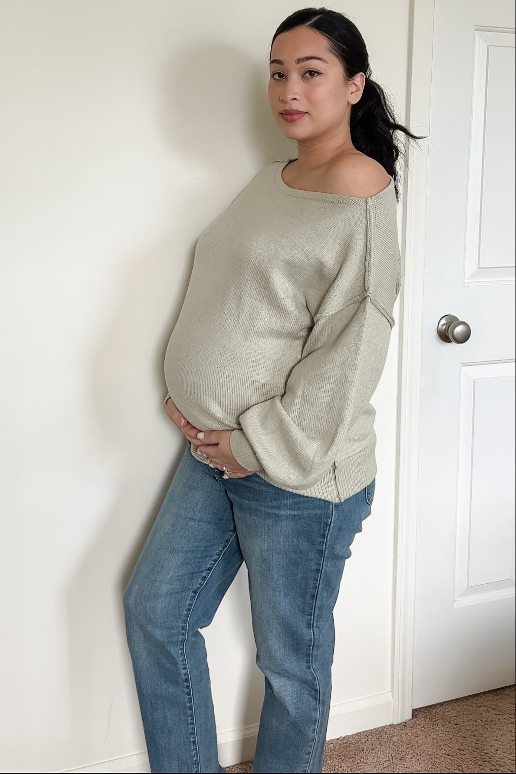 An ultra soft knit maternity sweater featuring a boat neckline, long bubble sleeves, and exposed seam detailing.