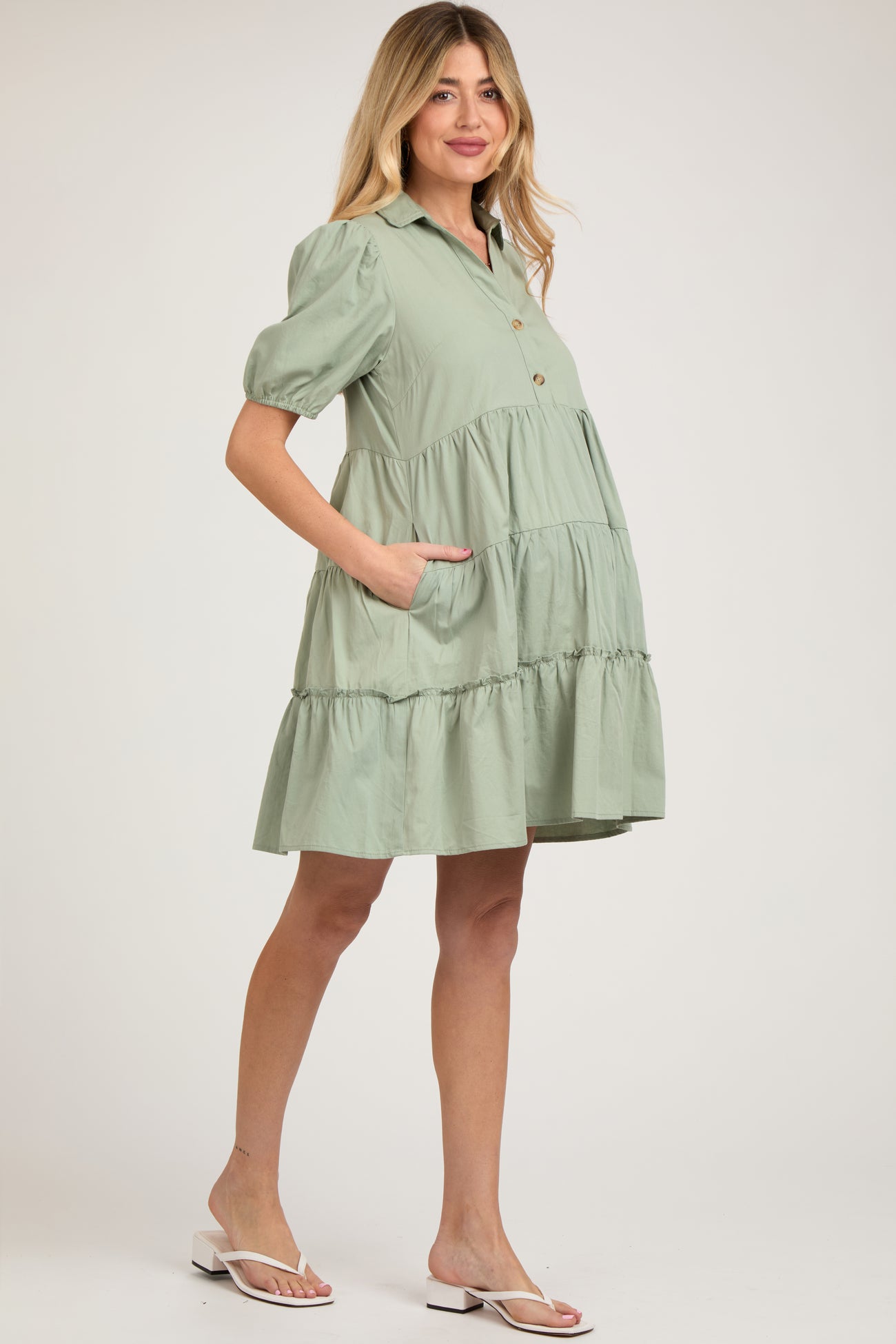 Details A solid maternity dress featuring front buttons, a collared neckline, side pockets, a tiered skirt and short sleeves. Content + Care