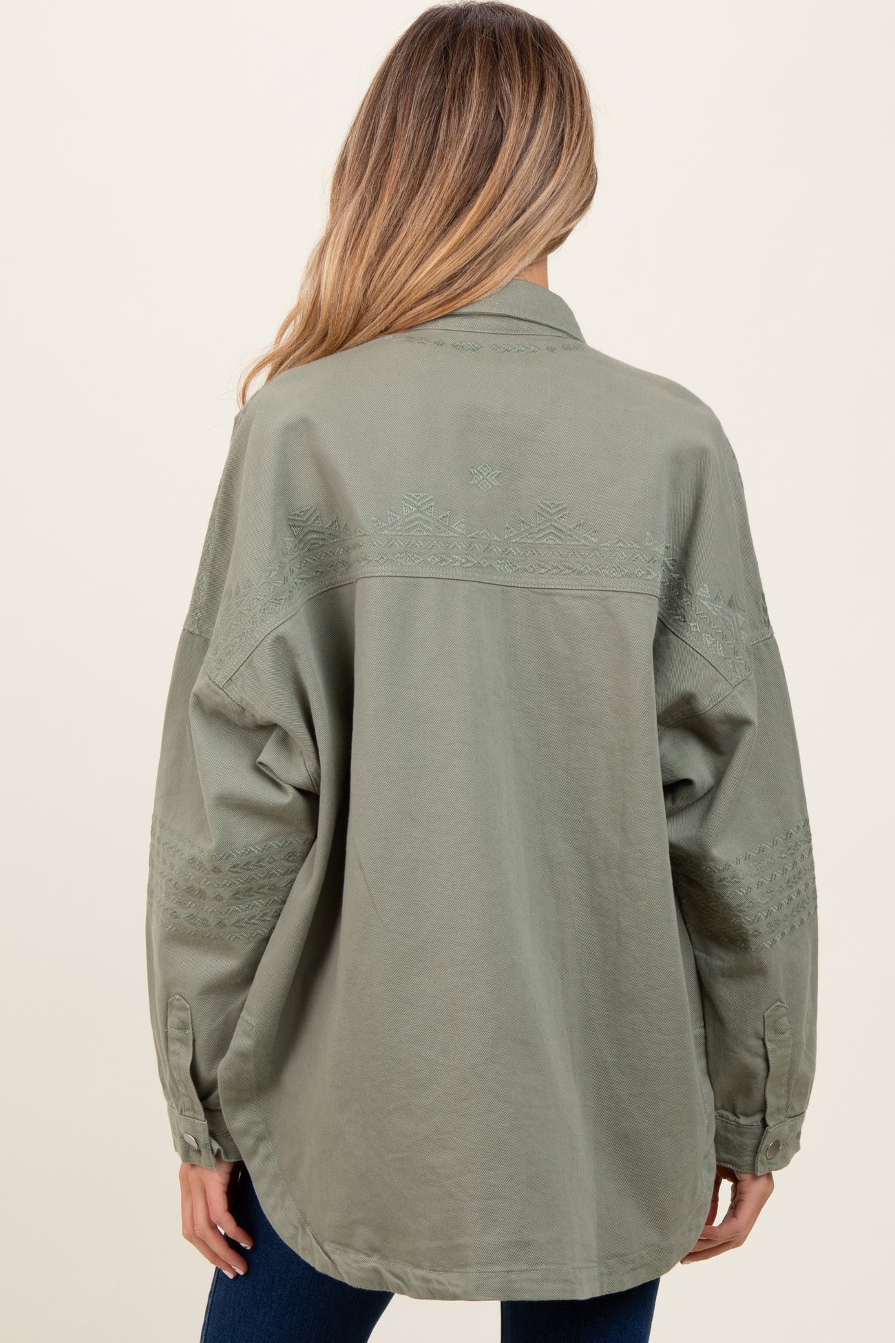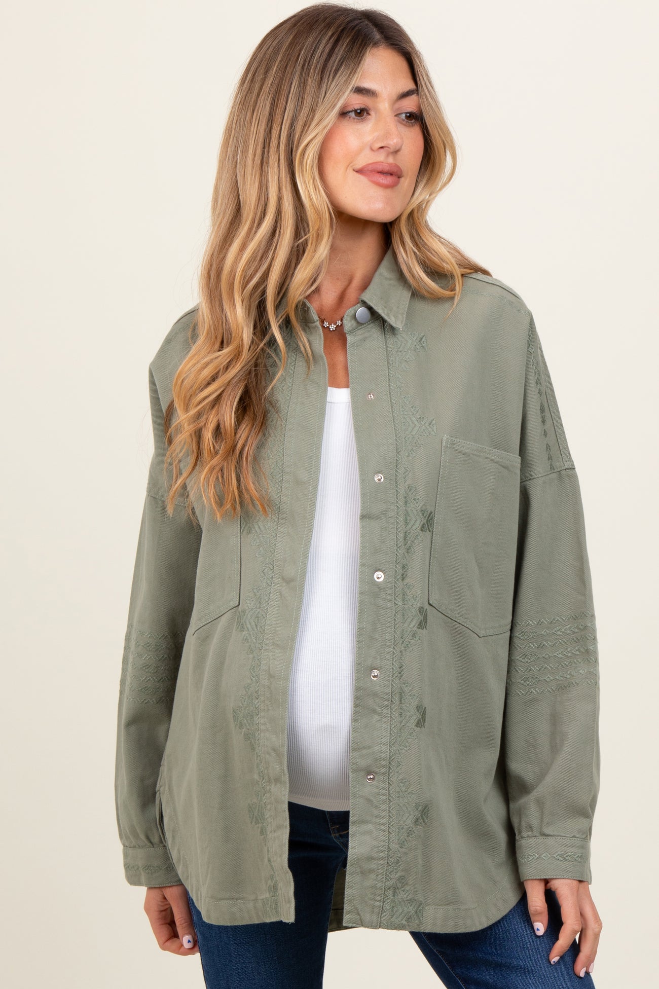 Light Olive Embroidered Snap Button Maternity Shirt Jacket