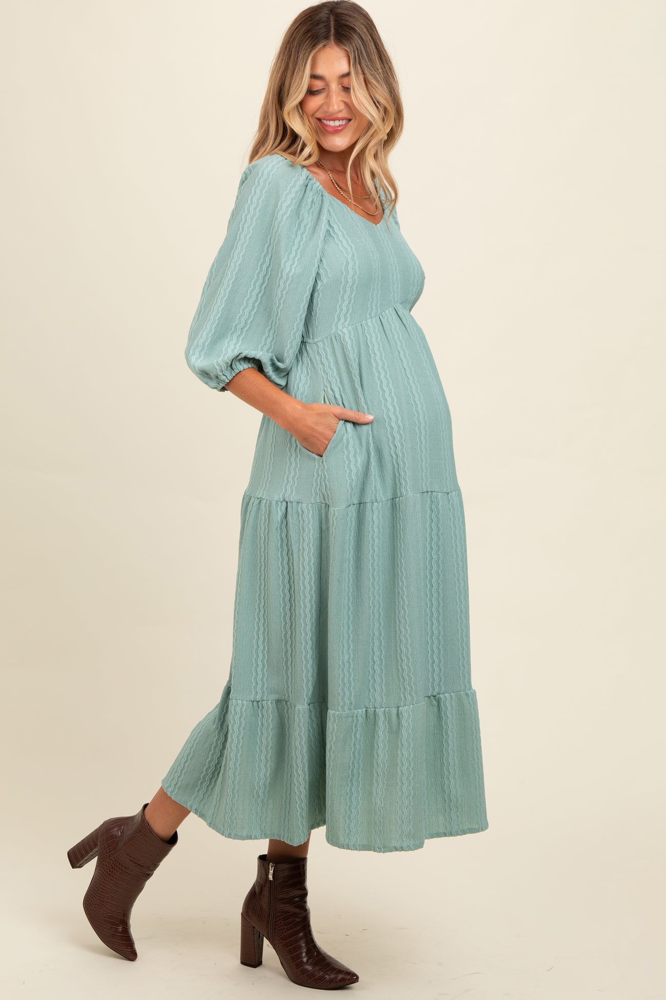 Light Olive Embroidered Tiered Maternity Midi Dress