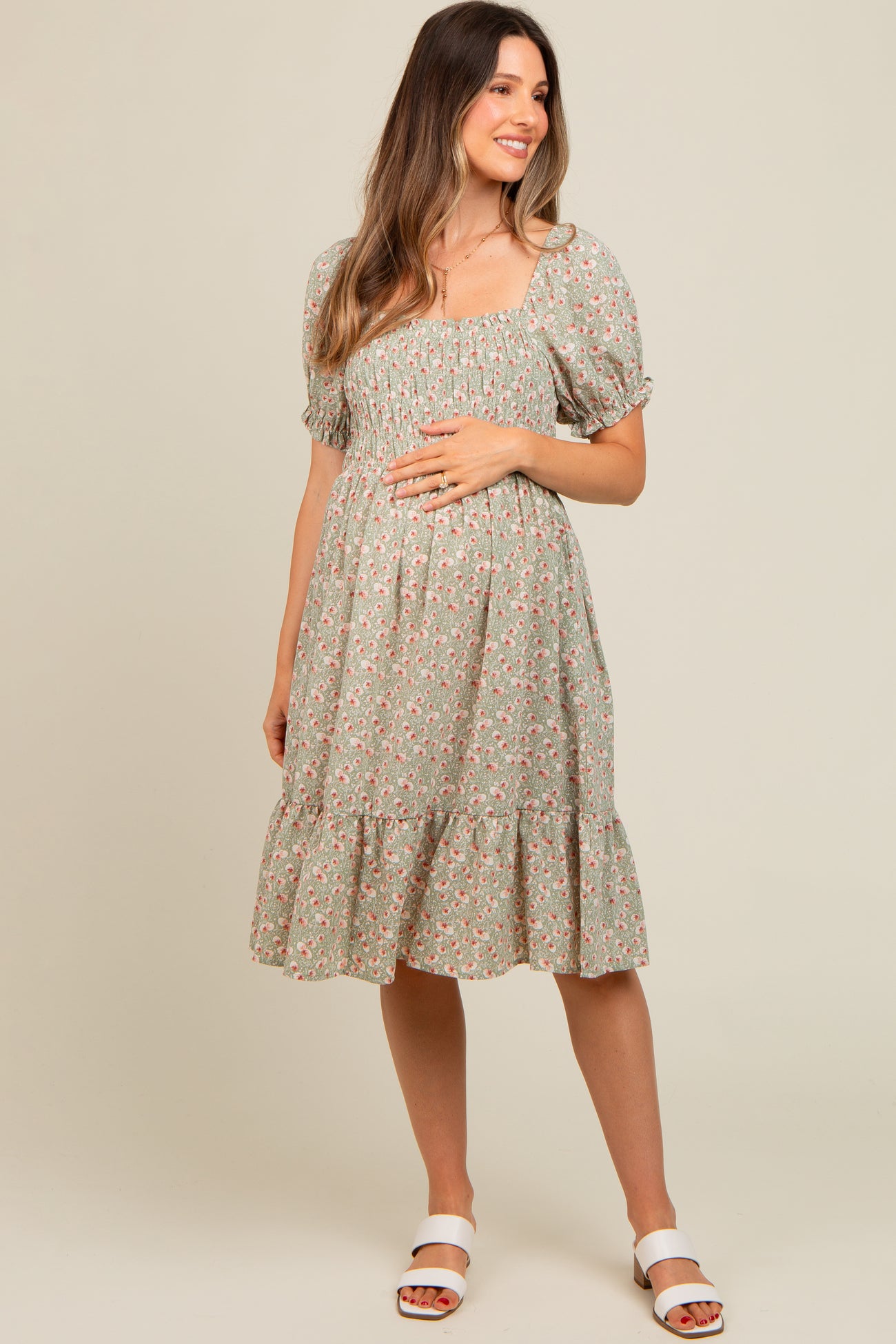 Light Olive Floral Smocked Maternity Dress