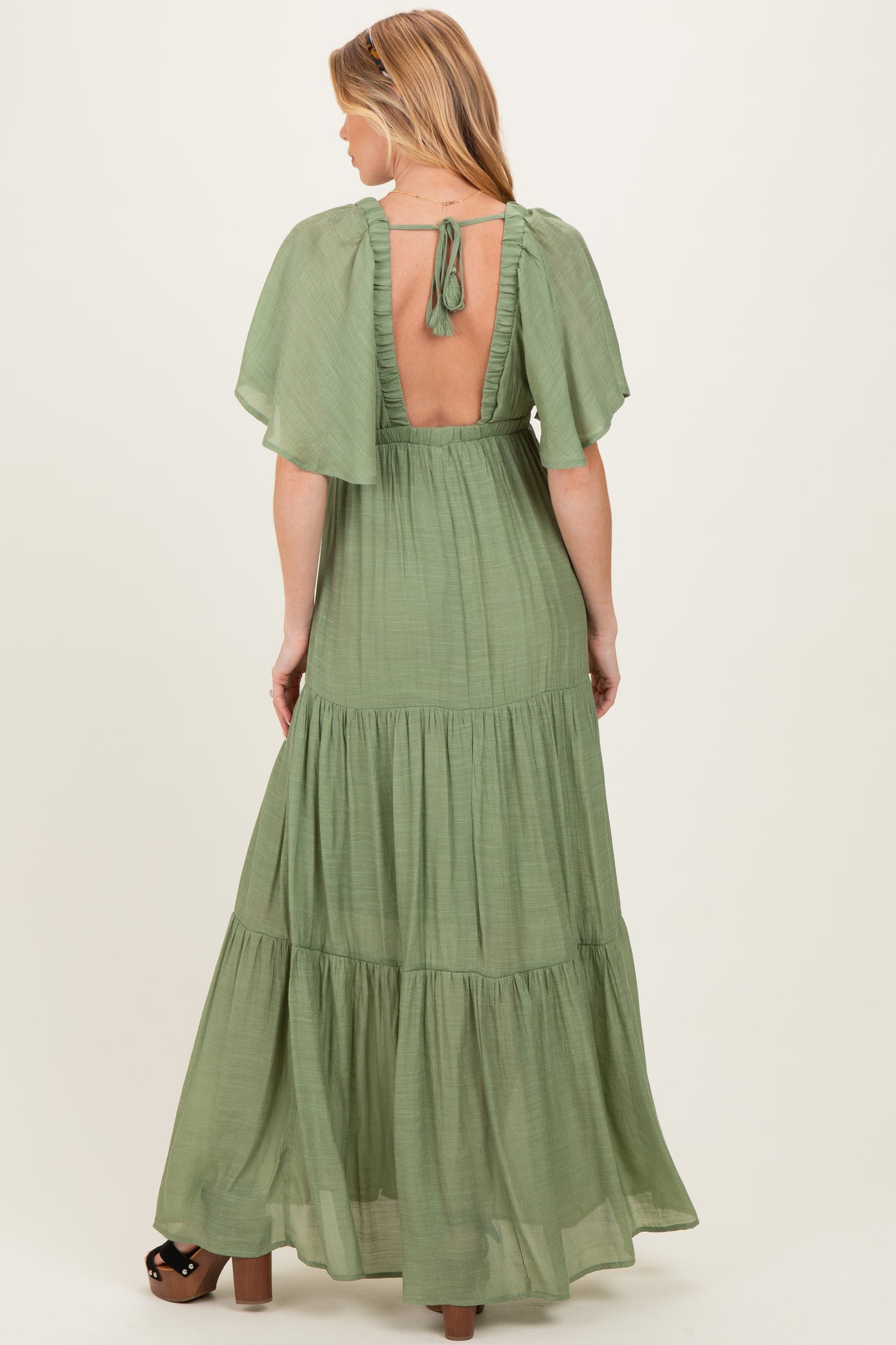 Light Olive Flutter Sleeve Maternity Maxi Dress