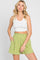 A pair of solid linen shorts featuring an elastic ruffled waistband and side pockets.