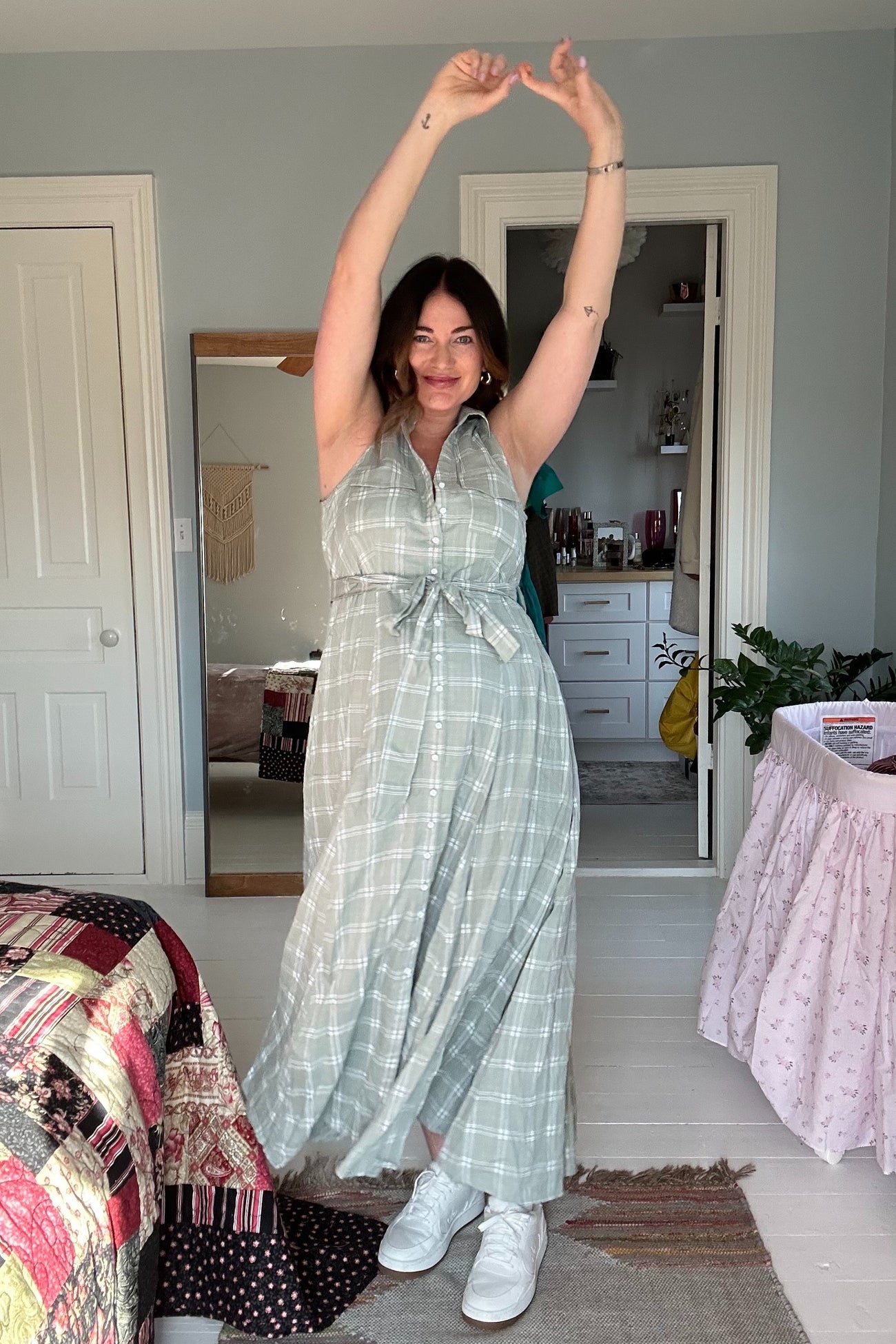Light Olive Plaid Sleeveless Sash Tie Maternity Shirt Dress