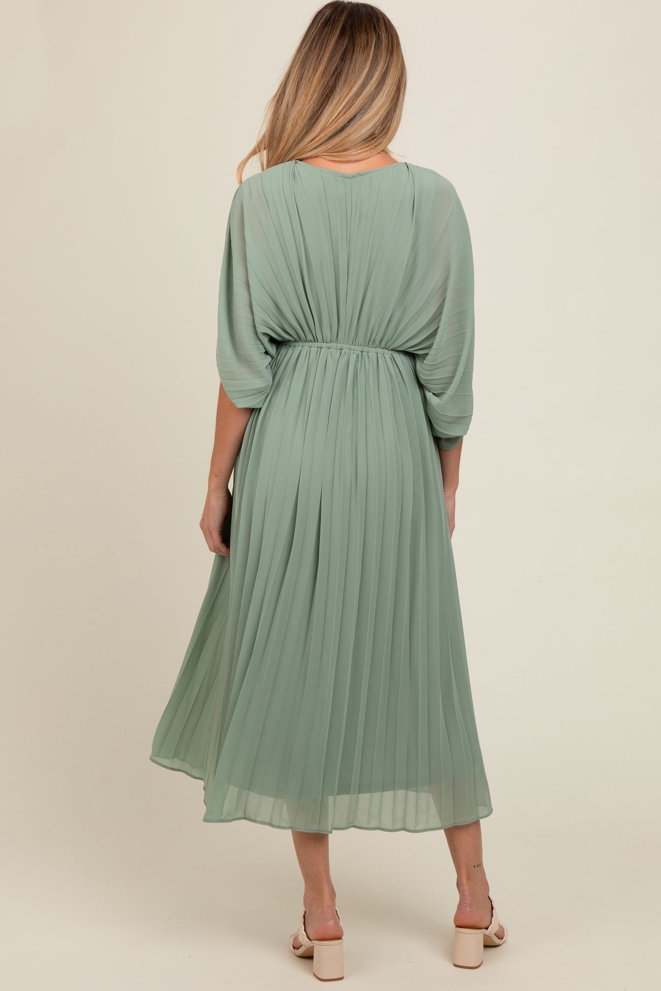 Light Olive Pleated V Neck Maternity Maxi Dress