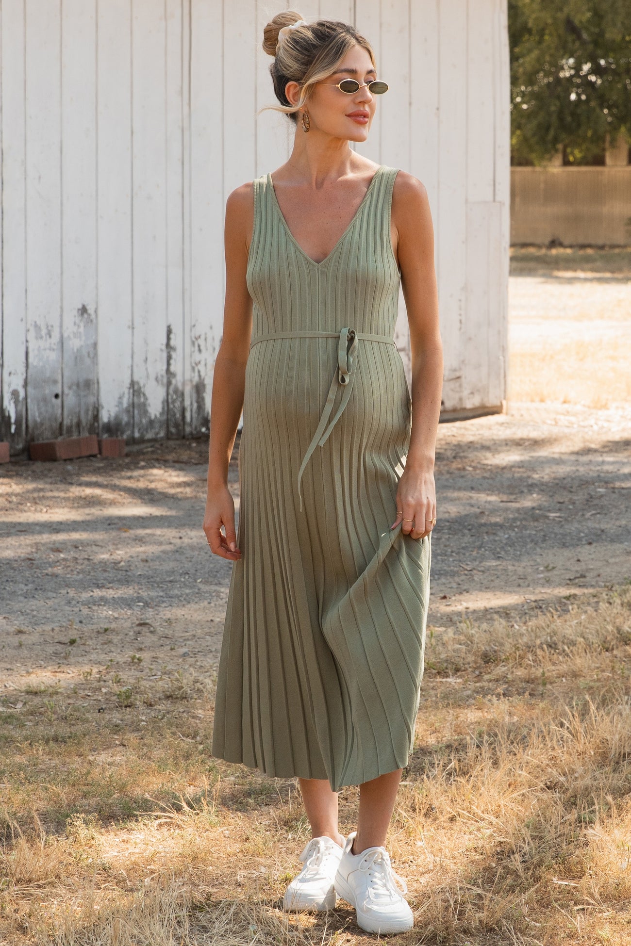 Light Olive Pleated V-Neck Waist Tie Sweater Maternity Maxi Dress