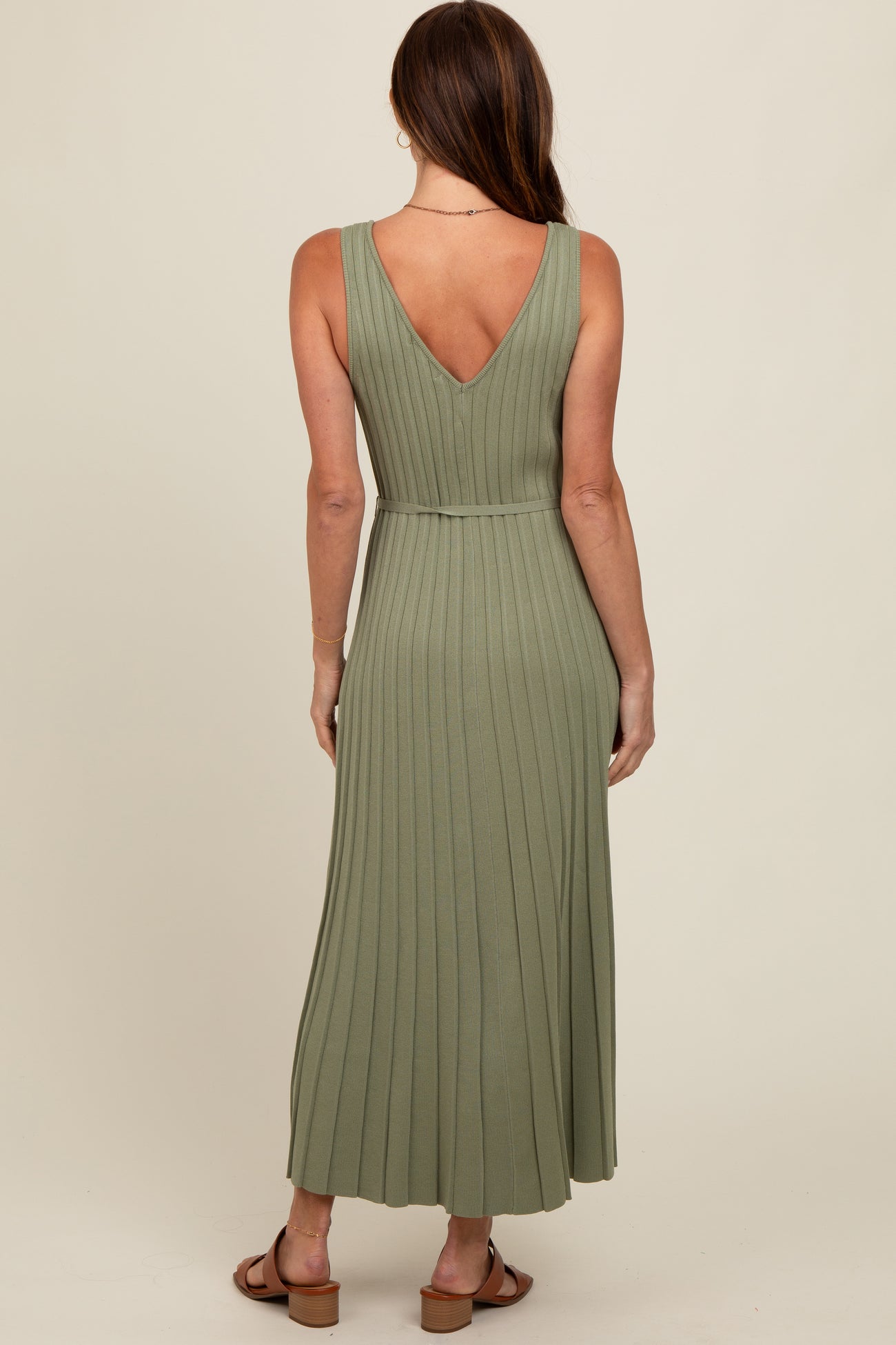 Light Olive Pleated V-Neck Waist Tie Sweater Maxi Dress