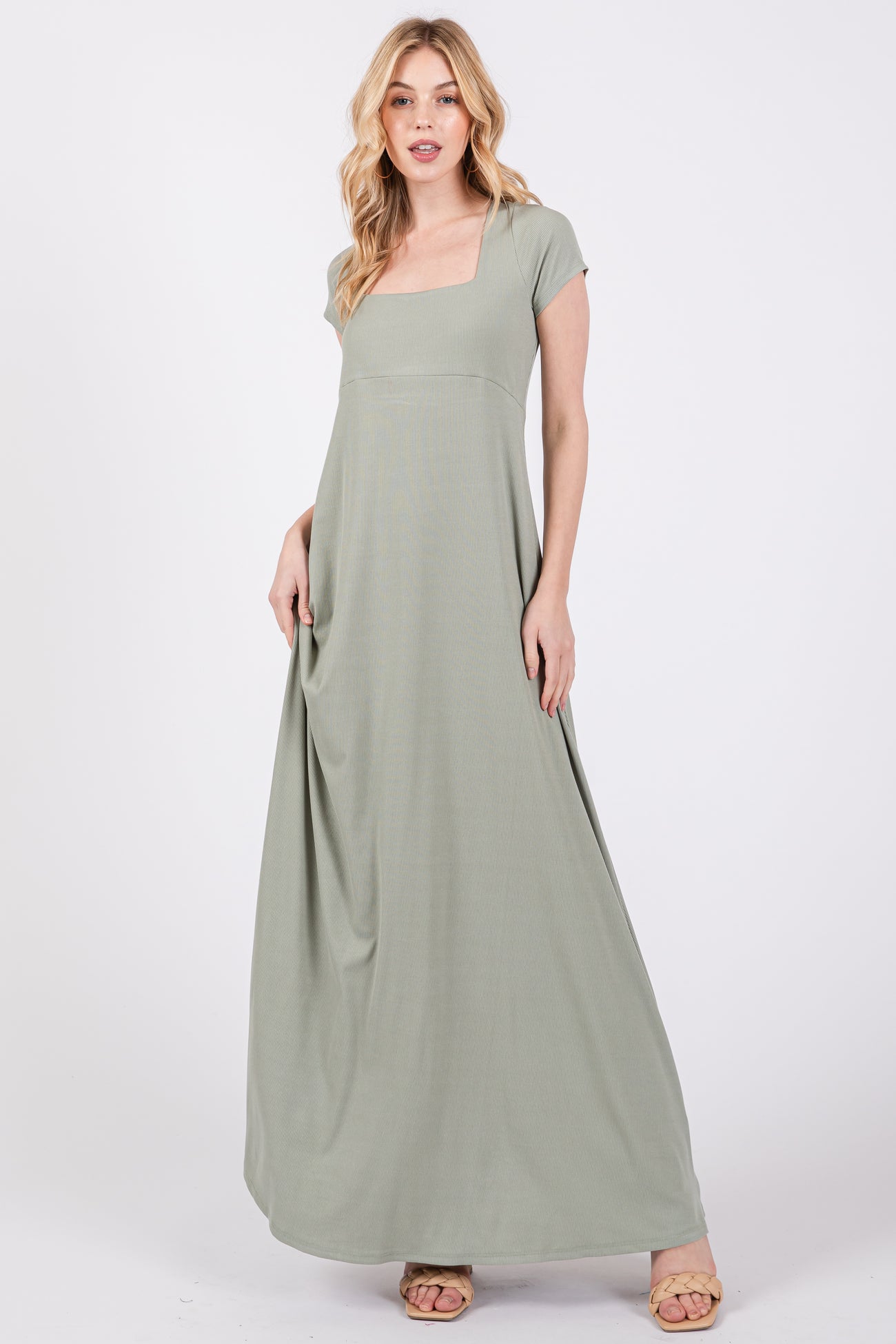 Light Olive Ribbed Square Neck Short Sleeve Maxi Dress