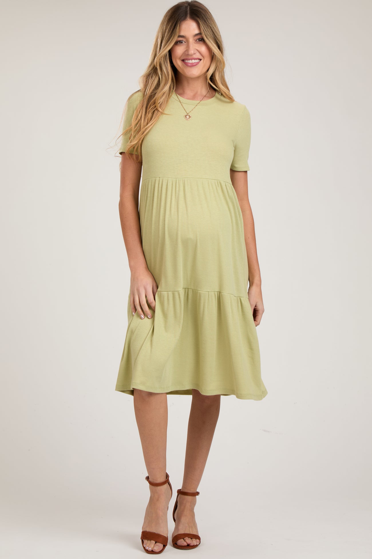 Light Olive Ribbed Tiered Maternity Midi Dress