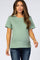 A solid hued maternity knit top featuring short sleeves and a rounded neckline.