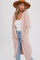A solid long open front cardigan in a chunky knit with two pockets in front.