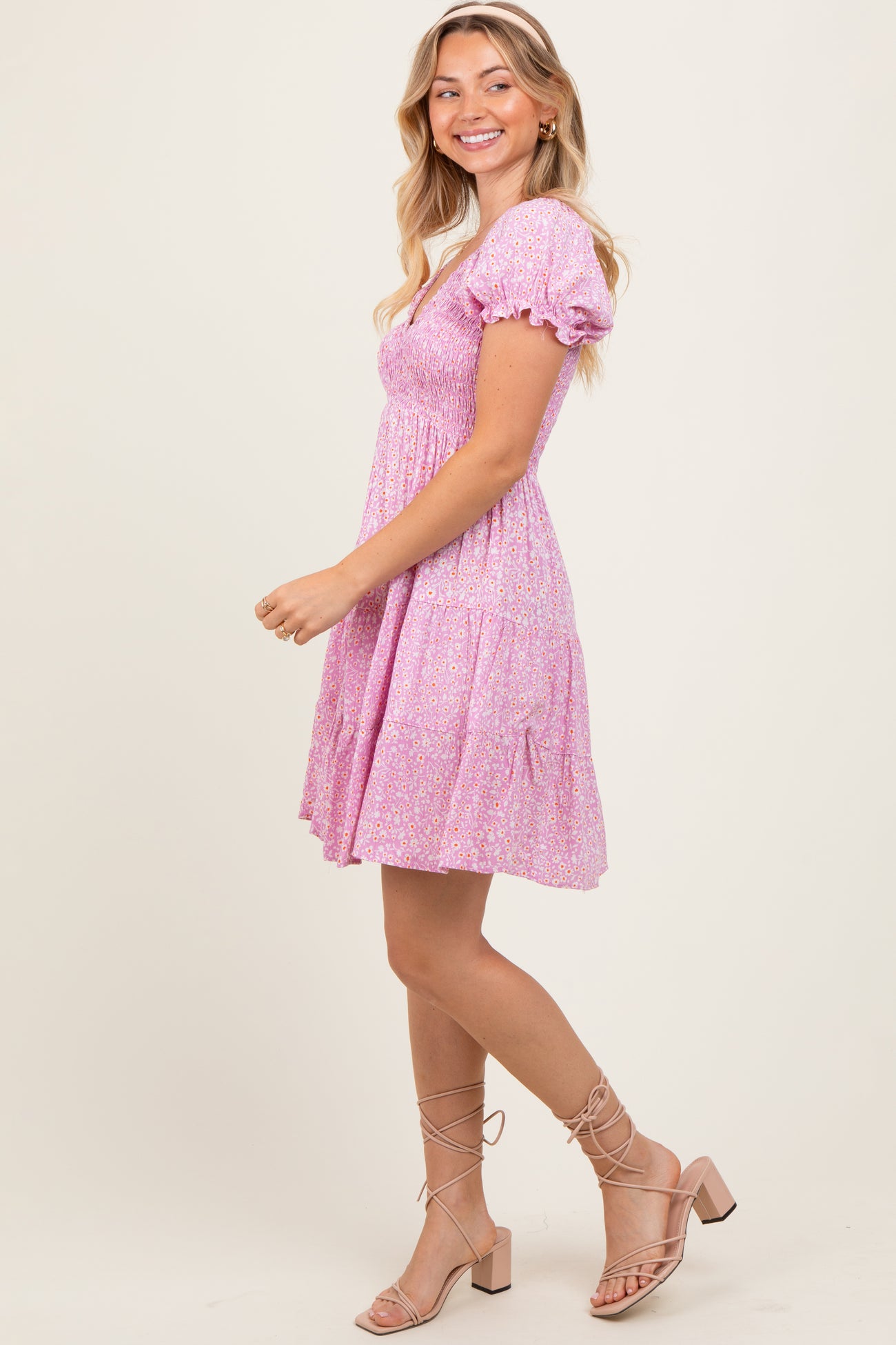 Light Pink Floral Smocked V-Neck Flutter Sleeve Dress