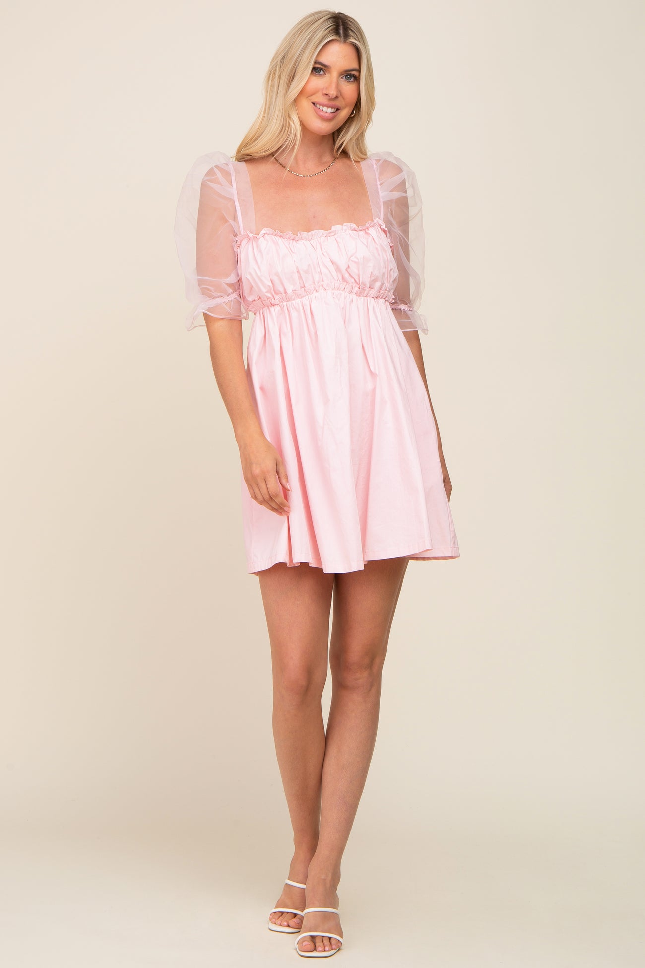 A solid mini dress with a ruched sweetheart neckline, sheer mesh puff sleeves, back tie and smocked back. Zipper with hook eye closure in back. Skirt is lined. Pocketed.
