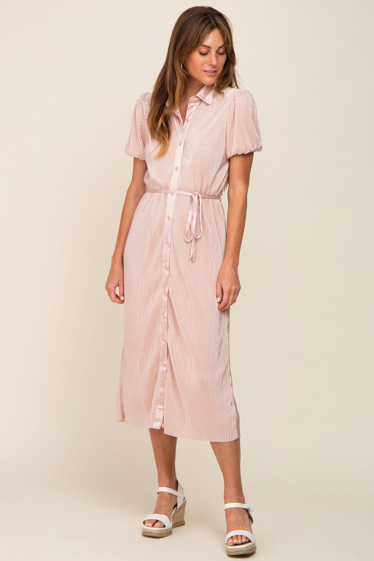 Light Pink Pleated Button-Down Collared Midi Dress