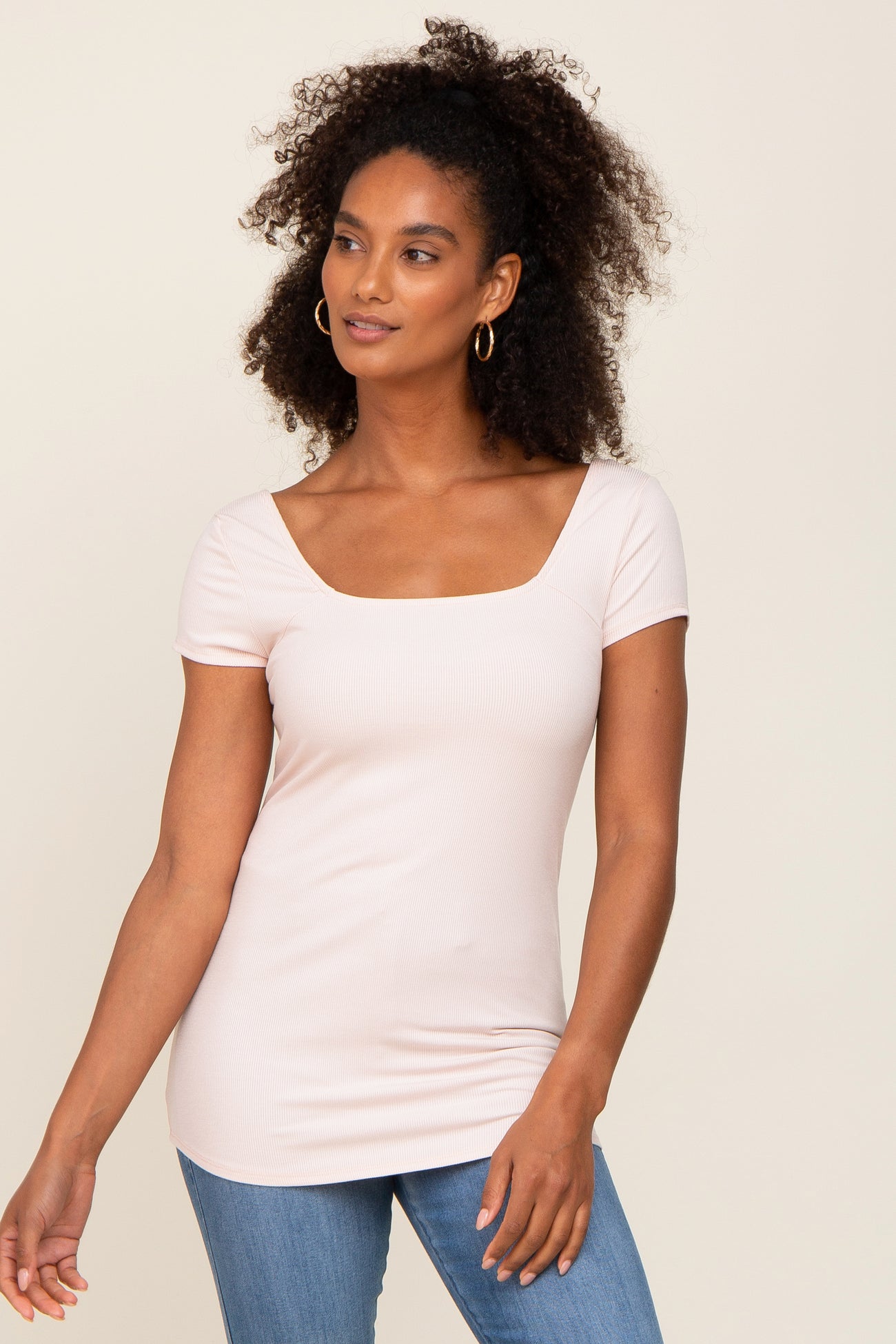 Light Pink Ribbed Squared Neck Cap Sleeve Maternity Top